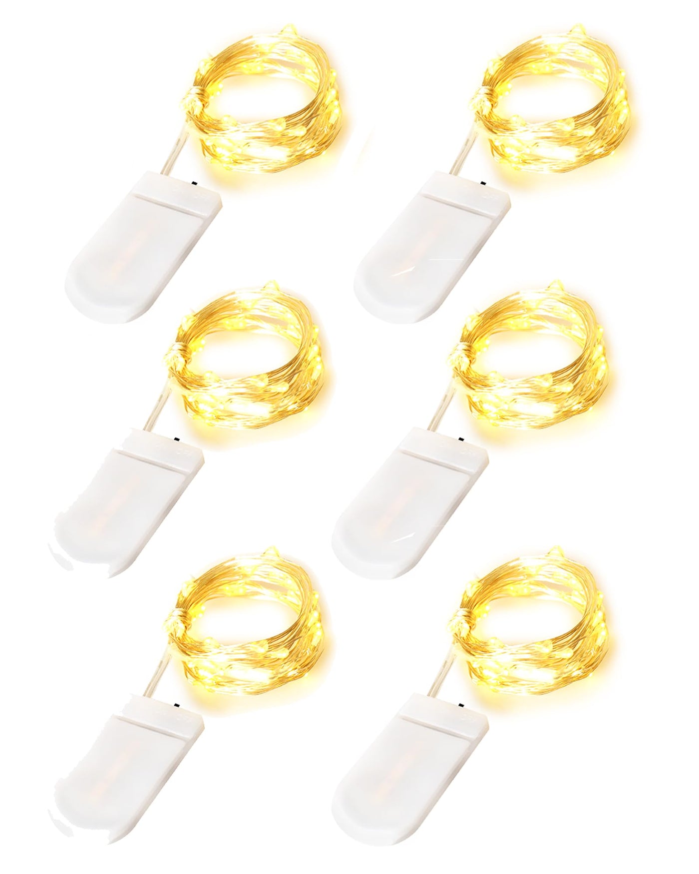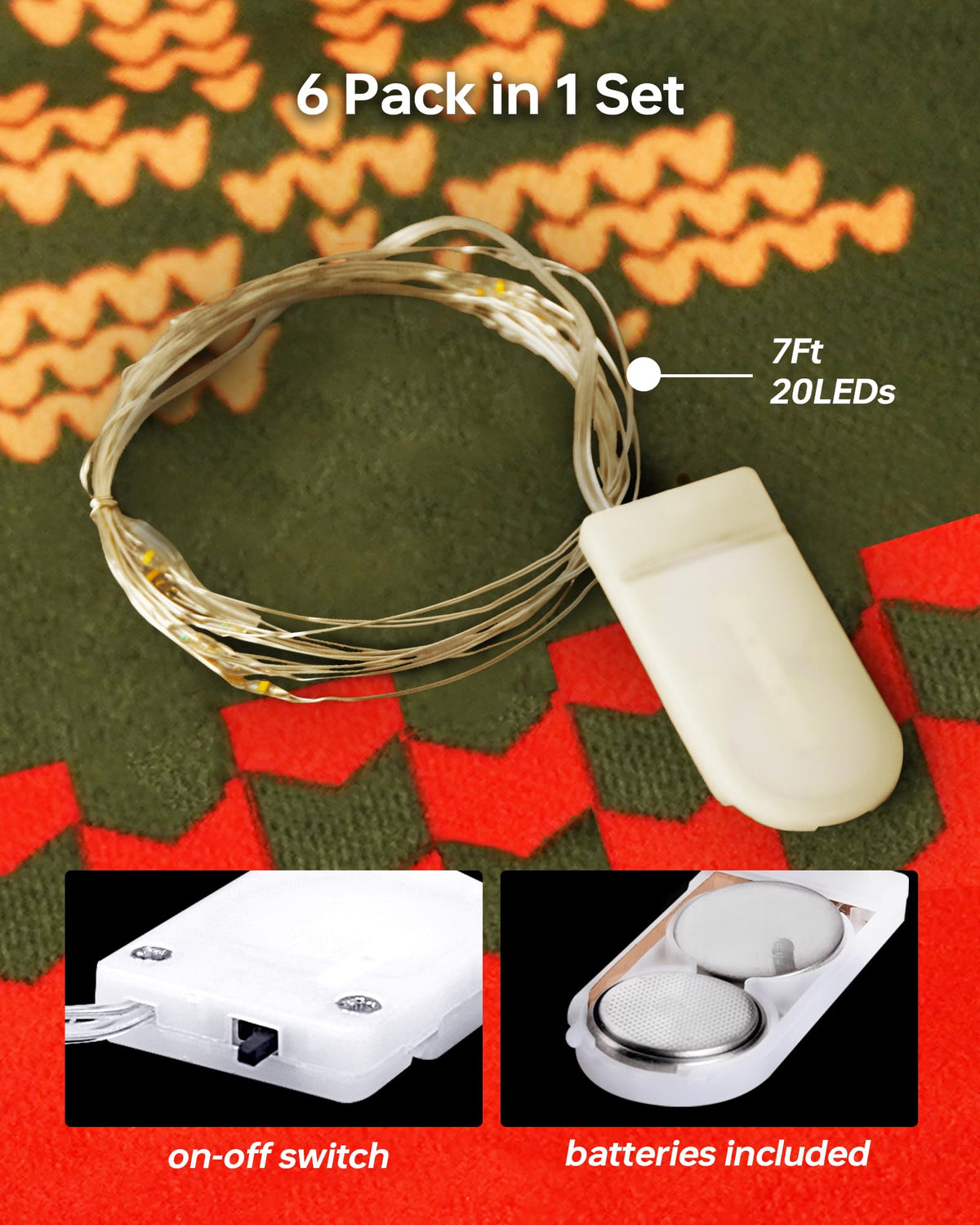 Specification:Pack: 6 Pack Length: 7Ft per string Bulb: 20LEDs per string Power Source: Battery Lighting Mode: Steady On Waterproof Grade: IP65 Wire Color: Silver Wire Lighting Color: Warm White
