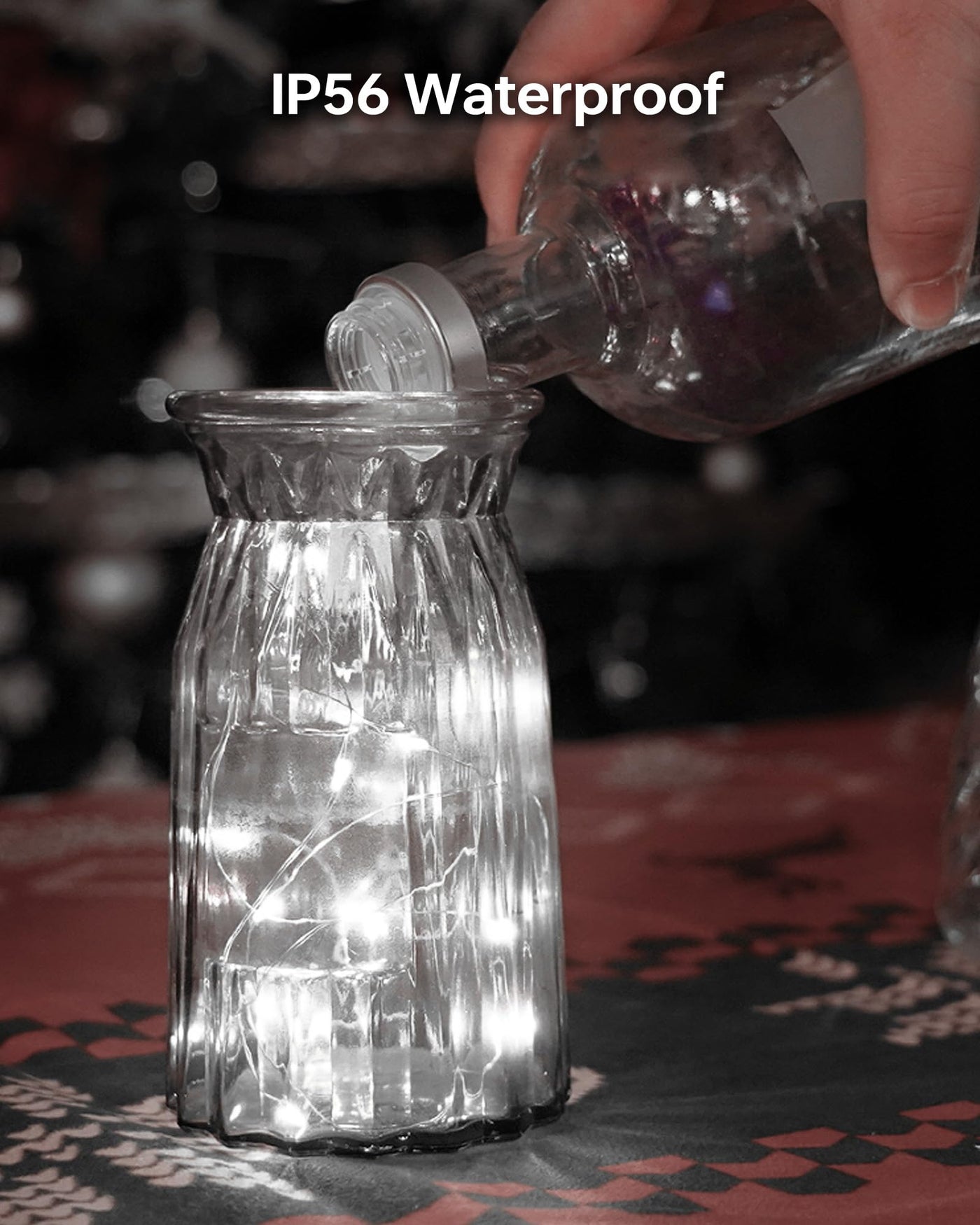 IP56 Waterproof: The strand of the lights is IP56 waterproof, you can enjoy these dreamy battery operated fairy lights inside your bedroom or outside on your patio, balcony, garden and so on. Notes: the battery case is not waterproof.