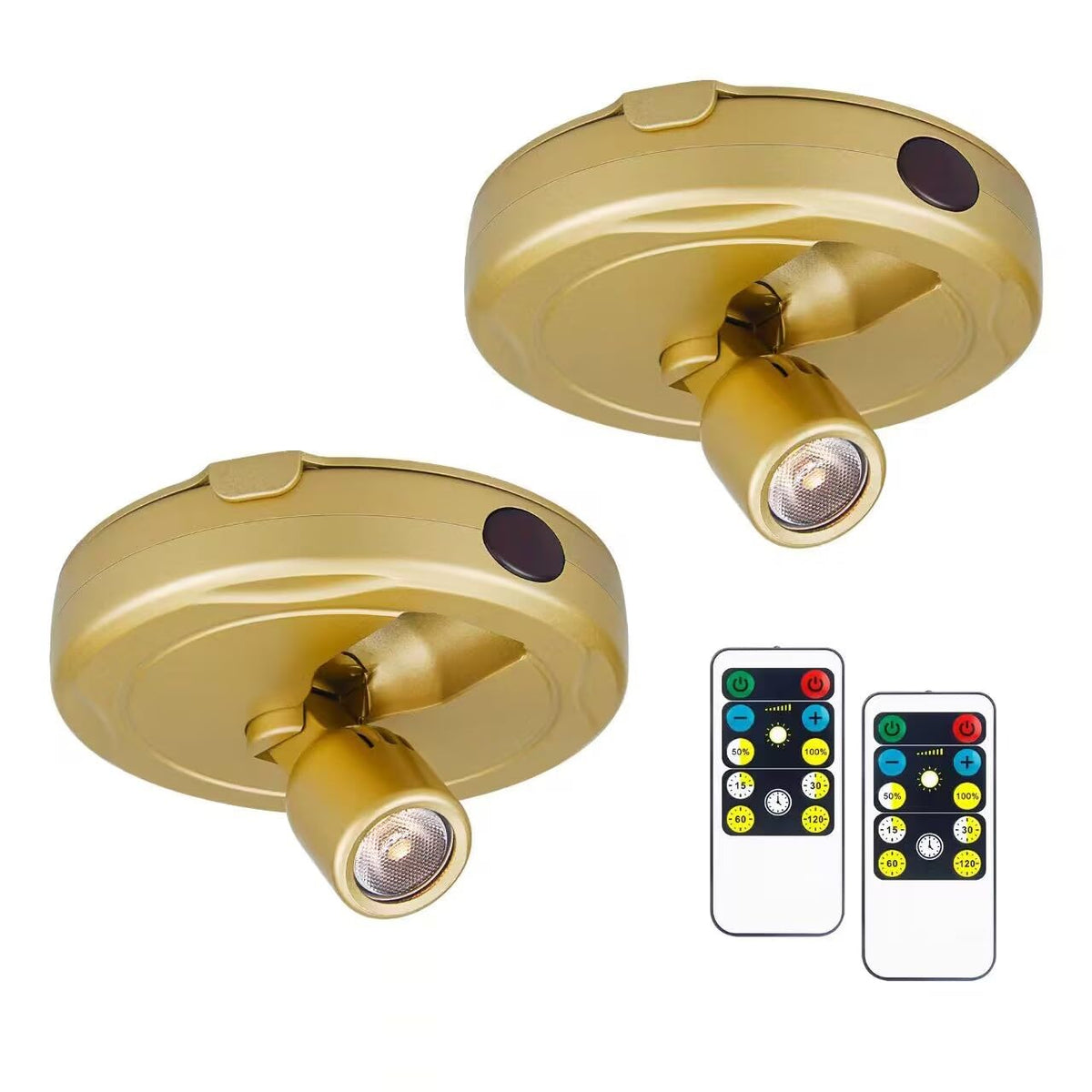 Battery spot light picture light for paintings on wall 3 AA batteries operated picture lights(battery not included) Remote control or push button to operate the spot light 2W 4.5V 200lumens 60hours runtime Warm lighting and brightness dimmable Timer auto-off by remote control in 15/30/60/120mins Packing list : Wireless spotlight x2 Remote control x2 Hook and Loop Tape x2 Screws x5 User manual x1
