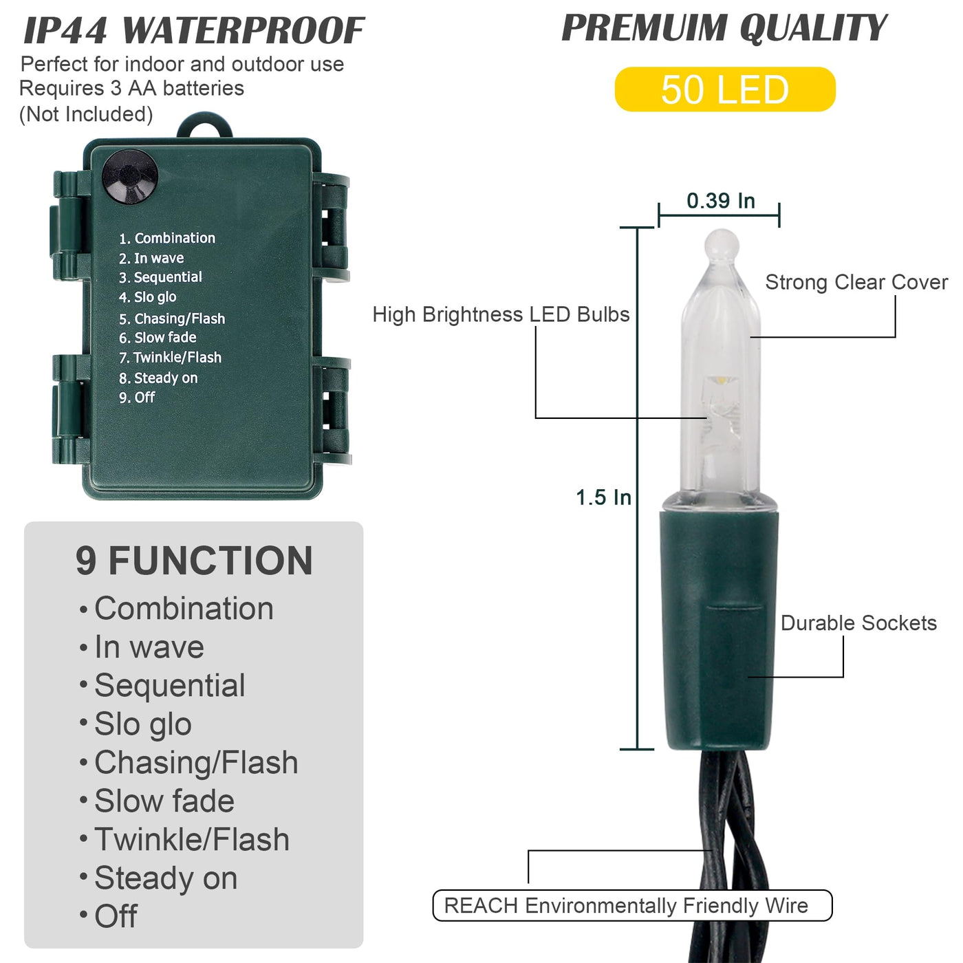 The Blissun Christmas Mini String Lights Feature 50 Energy-Efficient Led Bulbs On A 16Ft Black Cord, Offering Versatility For Various Decorative Needs. With A Leading Wire Of 1Ft, They Can Be Easily Positioned In Your Desired Location. The Warm White Light Emitted By These Led Bulbs Adds A Charming Glow, Ideal For Christmas Trees, Wreaths, And Other Holiday Displays. Designed For Convenience, These Lights Come With A Built-In Timer And Multiple Lighting Modes To Customize Your Experience.