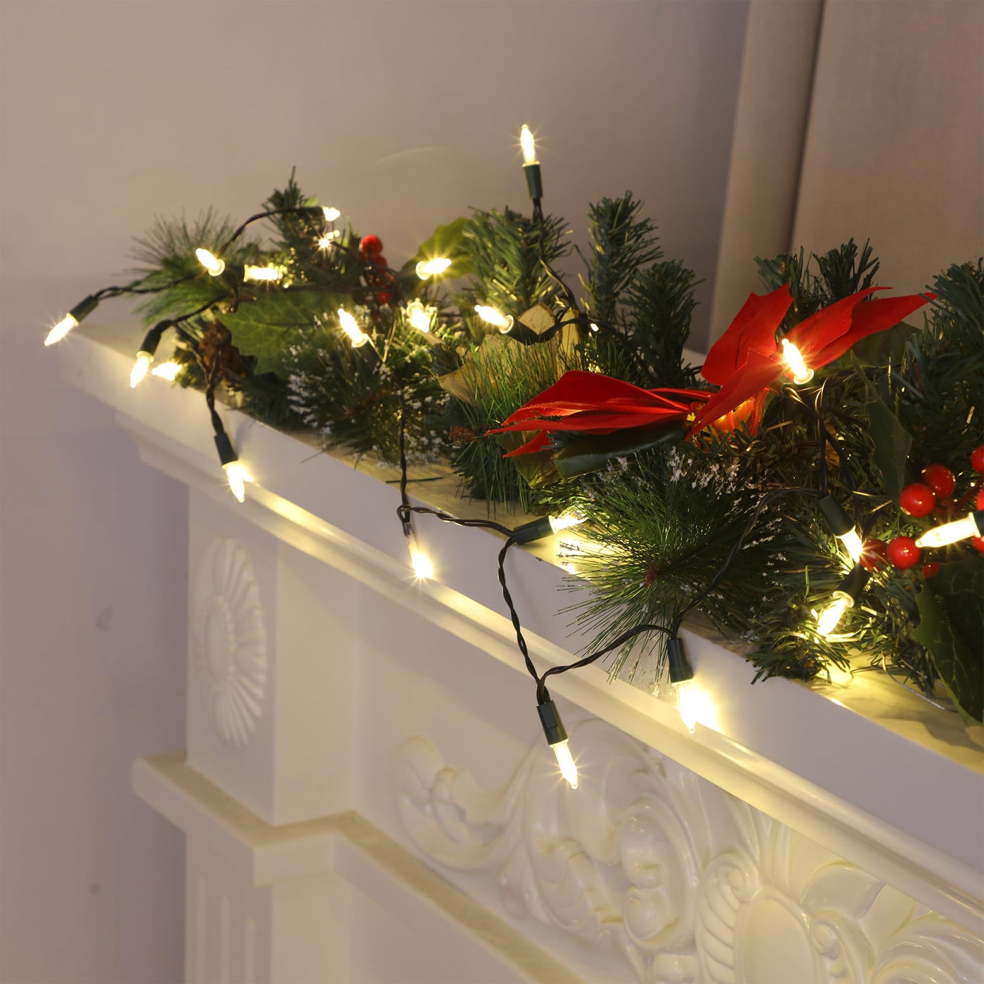 The Blissun Christmas Lights feature a durable green wire that blends seamlessly into your decorations. With a total length of 16 feet, this light set includes a 1-foot leading wire, making it easy to position in any desired location. The warm white LED lights provide a cozy glow, ideal for creating a festive ambiance during the holiday season.