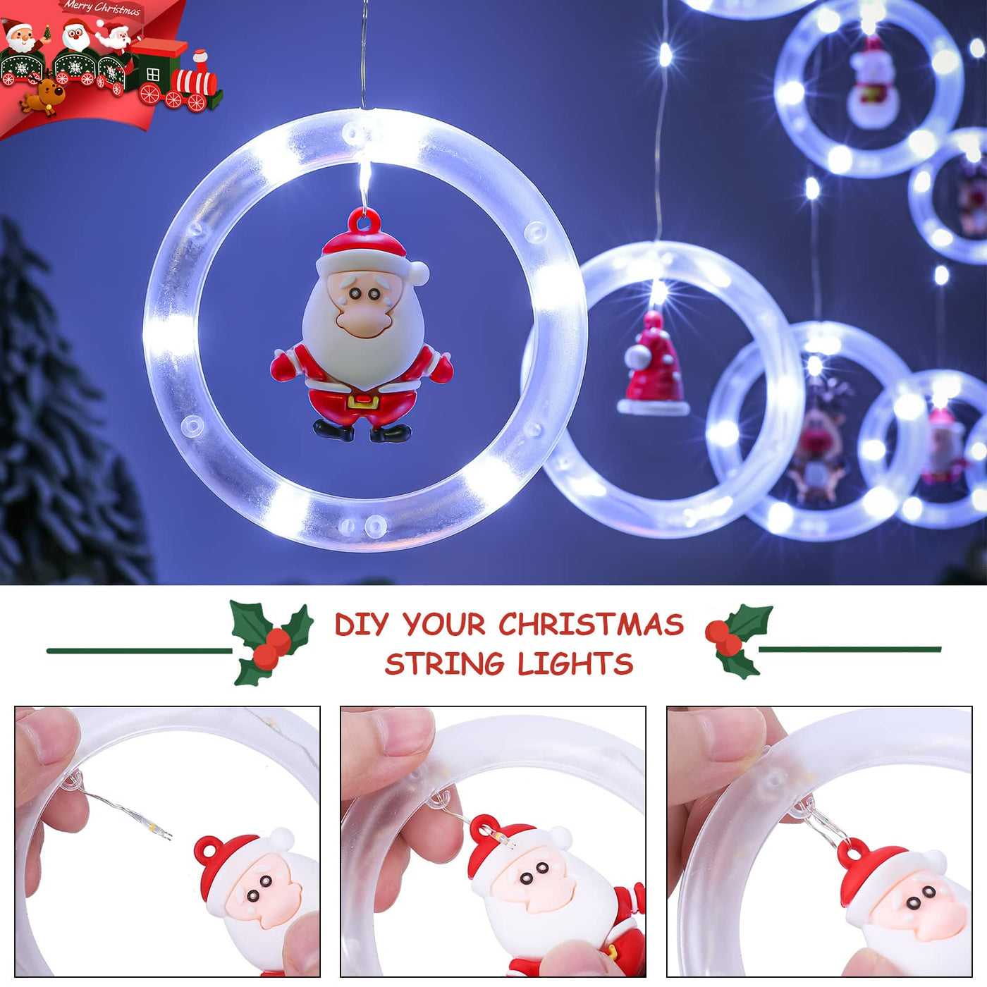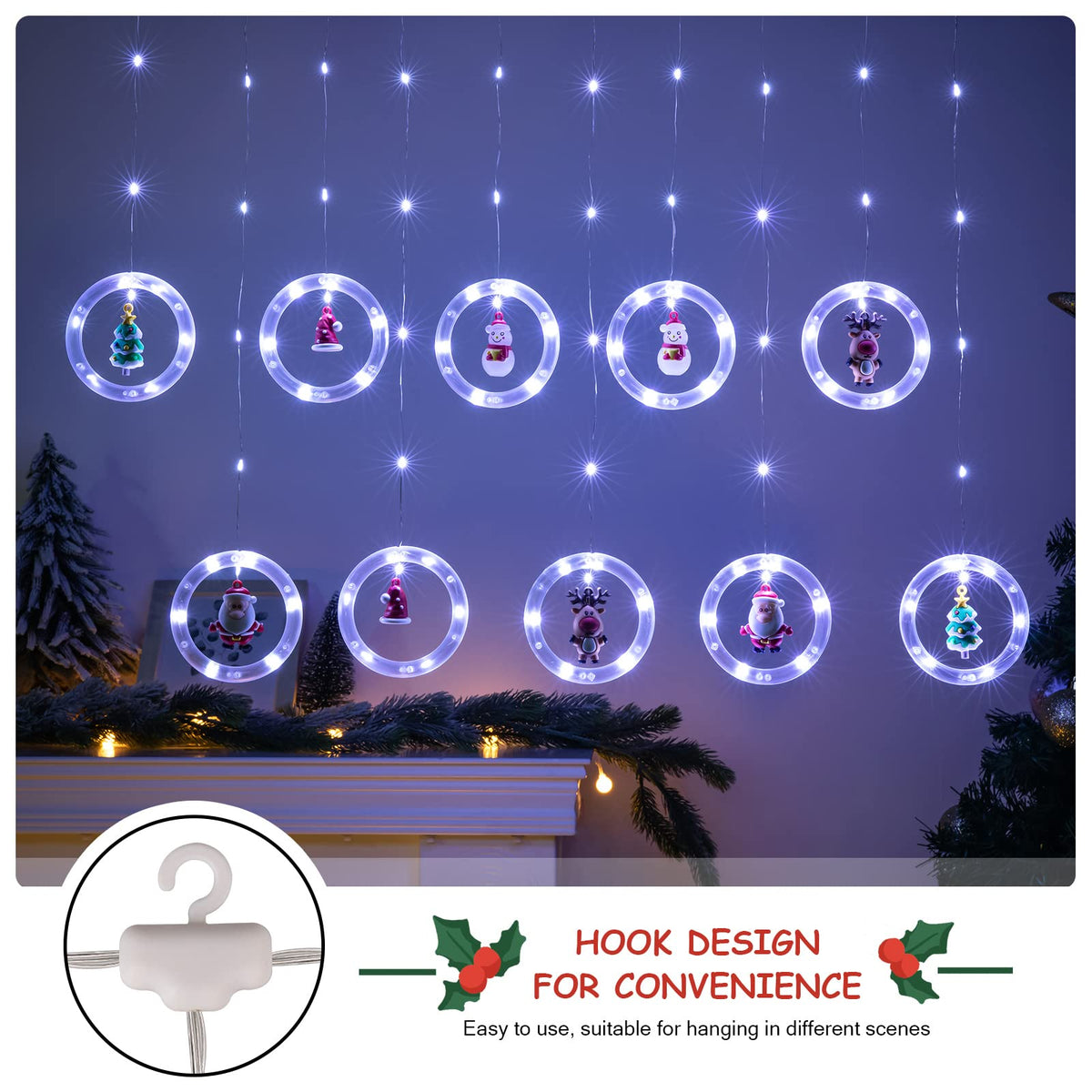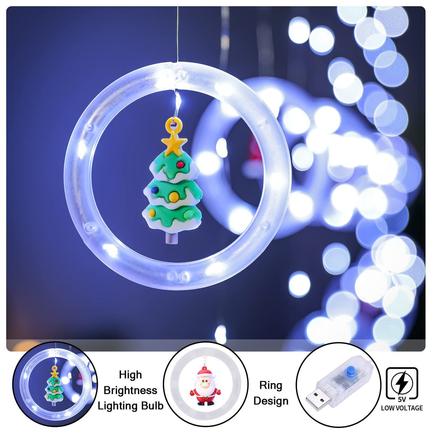 ??UNIQUE CHRISTMAS DECORATION LIGHTS - BLOOMWIN Christmas window lights come with 10 clear ring lights connected with LED curtain string lights and 10 Xmas theme little ornaments (2 Santa Claus, 2 snowmen, 2 Christmas trees, 2 reindeer, 2 Christmas hats). Creative and pretty design create a warm, special, romantic and gorgeous atmosphere for Christmas. | ??PREMIUM QUALITY - The Christmas hanging lights use durable dustproof and corrosion resistant PVC ring shell which features great light transmittance. The LED beads deliver bright but soft colorful light, not dazzling and beautifully illuminating the surroundings. | ?USB POWERED & 8 MODES - Everything is under the control of remote (aim at USB plug). Quickly turn on/off the remote control fairy lights plug in USB, multi-brightness levels and 8 lighting modes are available. This hanging Christmas lights has a 6/8 hour off/on timer. | ??EASY TO INSTALL - Just thread the LED bead on the ring through the tiny hole of the toy and bend it slightly. And you should fix the main string of our curtain string lights with hangers or tapes. With 10 hooks, the curtain lights can be hung easily and quickly with no tools required. | ?WIDE APPLICATION - Elegant ring string lights with adorable pendant create a sweet and inviting atmosphere, and they will be definitely loved by your kids, families, friends, beloveds. Illuminate with this amazing Christmas decoration light up your home, bedroom, window, curtain, door, wall, garden, patio, porch, fence, walkway and pathway.