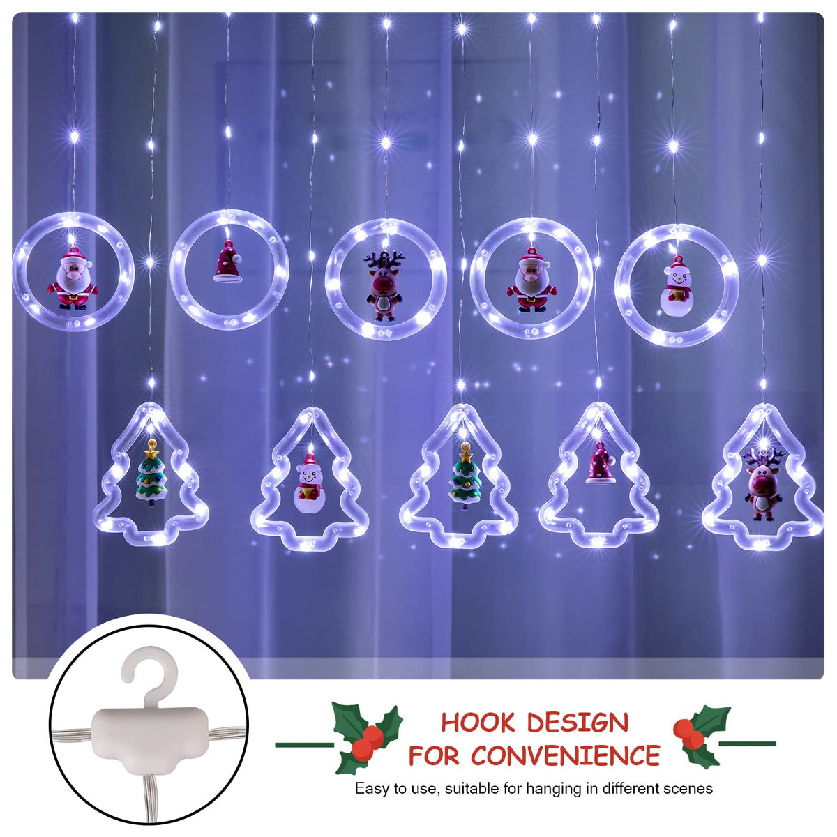 BLOOMWIN LED Christmas Curtain Lights for Window - Size : 9.8ft x 3.3ft - Unique design lighted tree and circle ring: 10 PCS - Color: warm white, cold white and multi-colored for option - USB powered - Remote control - 8 different modes