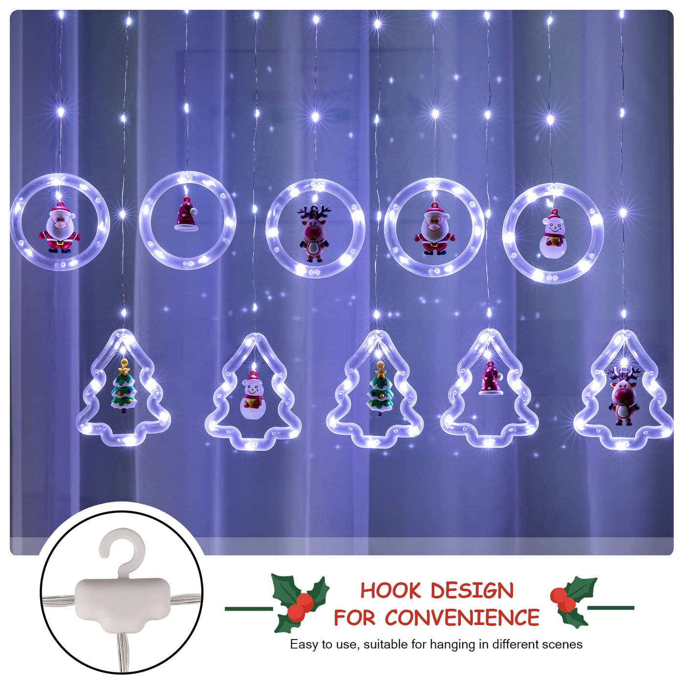 Q: What unique features do these window lights offer?A: The lights come with a unique design that includes 5 clear circle and 5 tree-shaped ring lights, along with 10 decorative ornaments, adding a festive touch to your holiday decor.