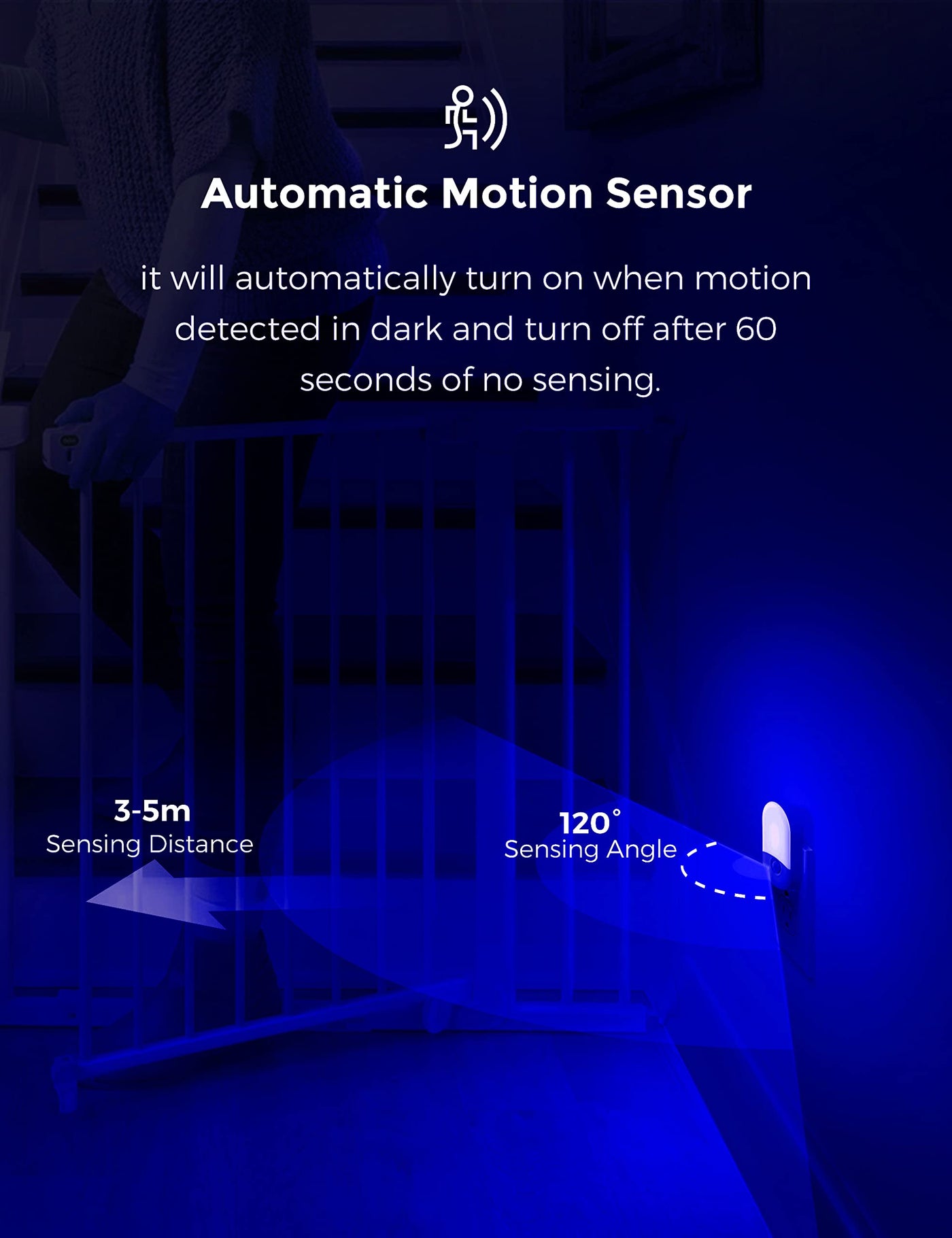 Q: How does the motion sensor work on the LOHAS Blue Night Light?A: The LOHAS Blue Night Light features a motion sensor that automatically activates the light when it detects movement in the dark. It will remain on for 60 seconds after the last motion is sensed, providing convenience and safety during nighttime.