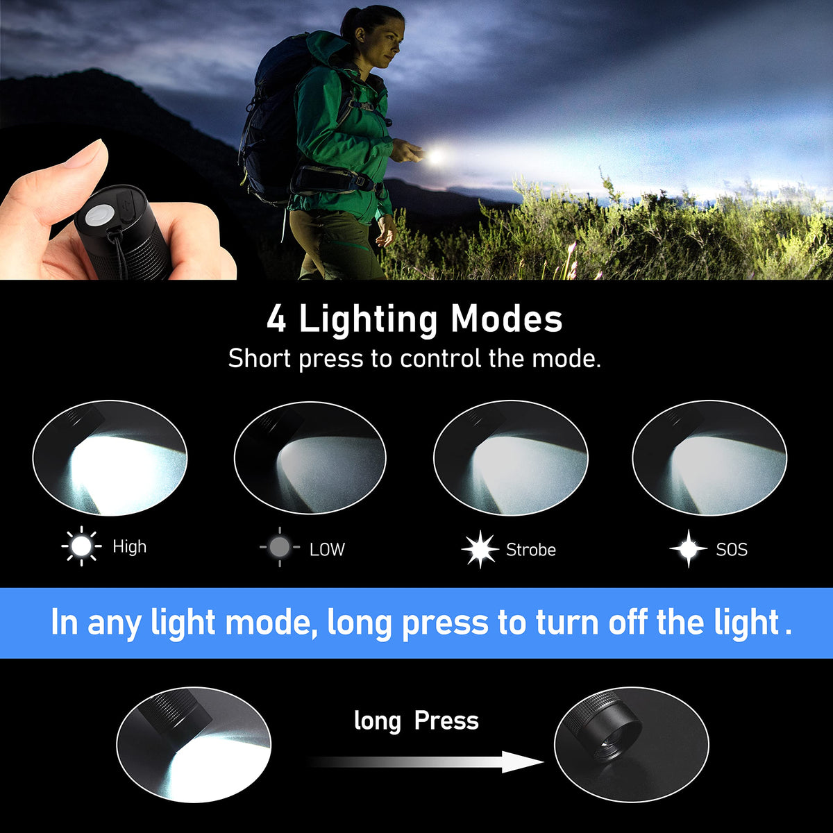 - **Versatile Lighting Modes**: Featuring 4 distinct lighting modes—High, Low, Strobe, and SOS—this flashlight adapts to your preferences with a simple one-button control. The zoomable design allows you to easily switch between a concentrated spotlight and a broader floodlight, providing flexibility for various environments.