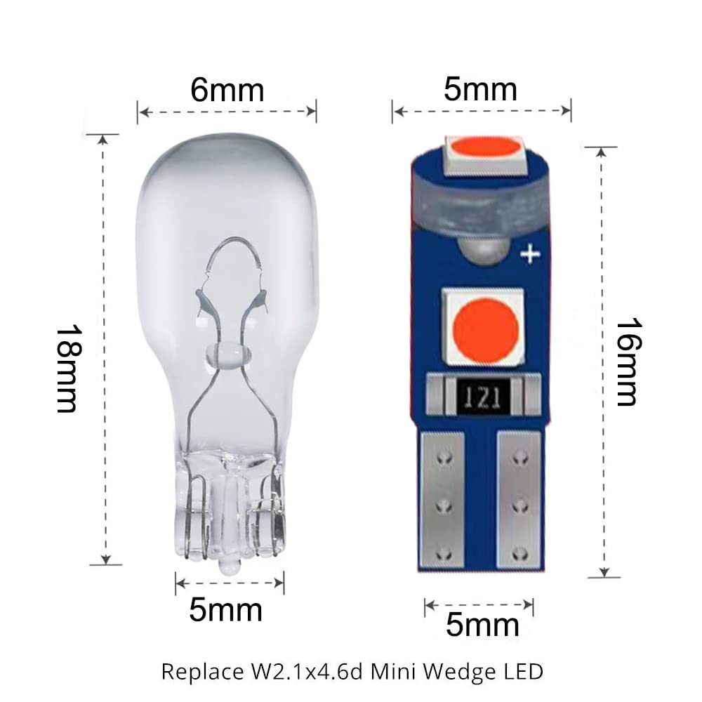 Specifications: Each bulb features 3030SMD LED chips with a quantity of 3pcs per bulb. Operating at a voltage of DC12V and wattage of 1W per pair (0.5W per bulb), they deliver an output of 0.0833A per bulb. Their compact size of 0.69in x 0.24in (17.5mm x 6mm) makes them easy to install.