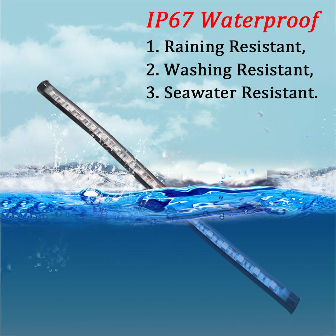 Specifications: Demension: 13'' x 1/2'' x 1/4'' Visibility Distance: 4 miles. Light color: Blue. Material: Made of ABS, sealed in silicone Voltage: 12V Service life: Over 10000 hours Waterproof Rating: IP67 Led Chip Quantity: 18 Led Chip Type: 5050 Wire Length: 32 inch Wire Guage: 22AWG Adhesive type: 3M LOW POWER CONSUME: Energy-saving, Low temperature, Low Amp Draw For a Longer Lifespan over 50,000 hours. Lights are flexible for mounting on irregular surface