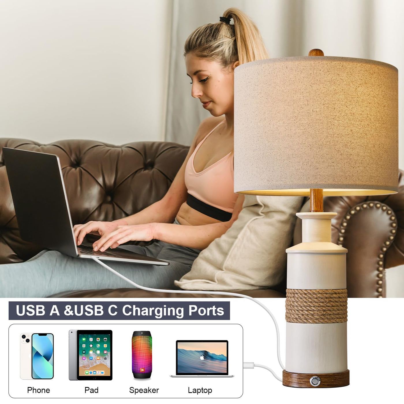 Bobomomo 24.5'' Usb A+C 3-Way Dimmable Touch Control Boho Table Lamp Set Of 2 For Living Room Nightstand Beside Lamps For Bedroo