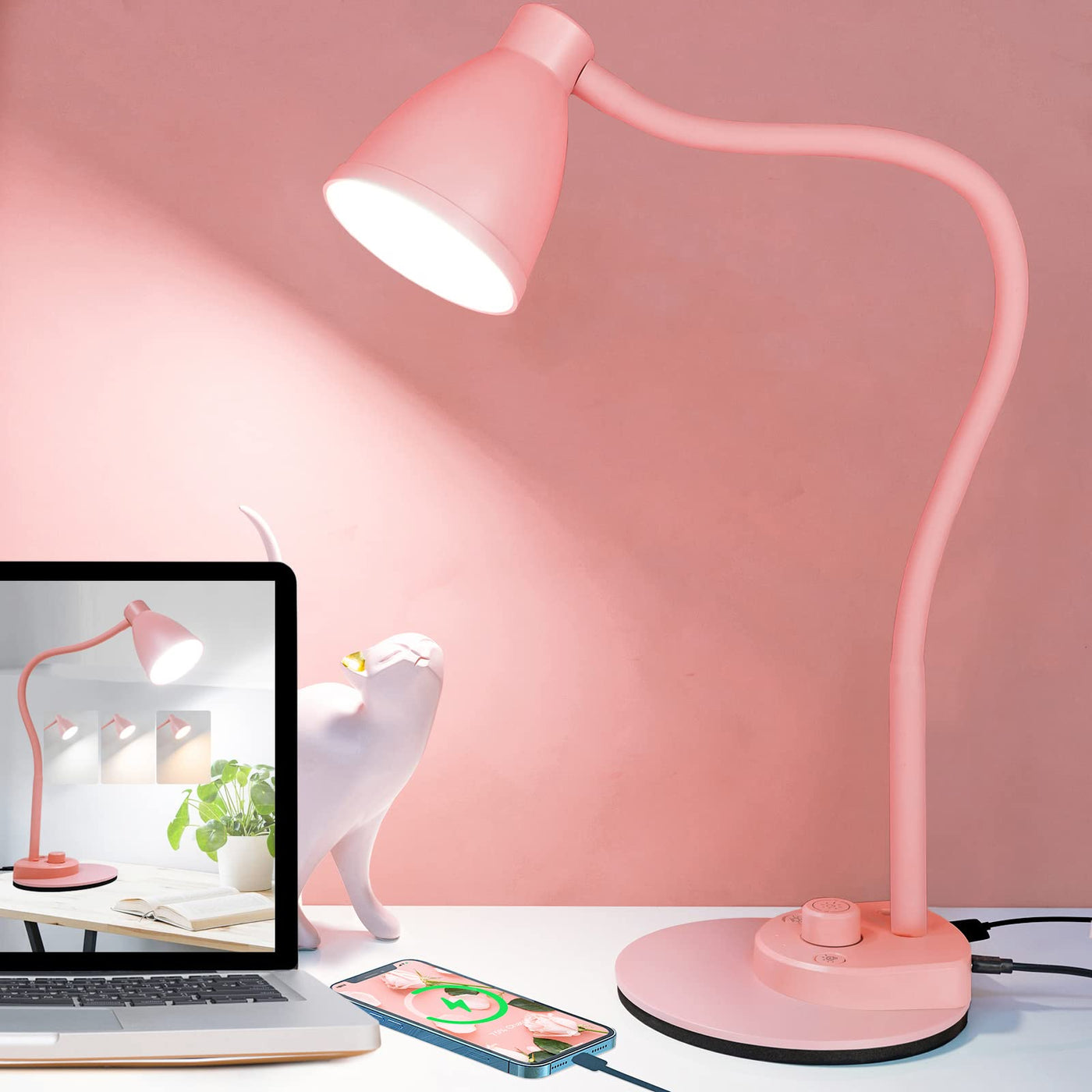 Bohon Cute Desk Lamp With Usb Charging Port, Pink Lamp 3 Color Modes Dimmable Reading Lamp, Flexible Gooseneck Table Light Auto Dimming Task Lamp, Led Desk Light For Home Office Dorm Bedside, Pink