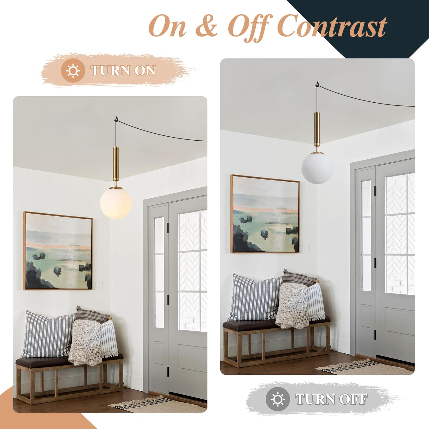 Description: Name: Glass Globe Pendant Lamp Plug In Material: Metal & Glass Color: Gold & White Height: 15.6 (40Cm) Globe Diameter: 7.9 (20Cm) Hanging Cord: 14.76Feet (4.5M) Light Source: E26 Base Bulb Size: G45/A15/A19 Type Of Bulb: Incandescent, Led, Cfl And Halogen Bulbs Special Feature: Adjustable Height Style: Modern/ Nordic/ Contemporary Specific Uses: Indoor Voltage: 110-250V For Worldwide Wattage: Max 60 Watts Recommended Area: 5-8M Package Listed: 1* Hanging Glass Pendant Light Plug In 1* Accessories Kit 1* Customer Manual Warm Tips: 1. For A Longer Service Life, Please Install And Use It In A Dry Environment. 2. Do Not Touch The Light Bulb When It Is Working Well. 3. Keep Flammable Materials Away From The Lamp. 4. Before Replacing The Light Bulb, Cut Off The Electricity Supply And Allow The Bulb To Cool.