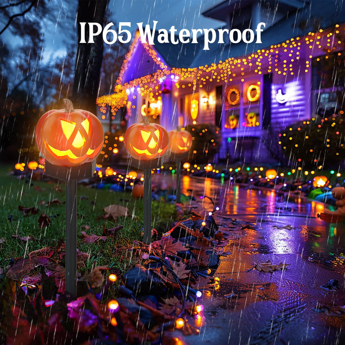 Q: Are the Halloween decorations waterproof?A: Yes, these solar-powered pumpkin lights are designed with an IP65 waterproof rating, making them durable and suitable for various weather conditions, including rain and snow. This ensures that your outdoor decorations remain intact and functional throughout the Halloween season.
