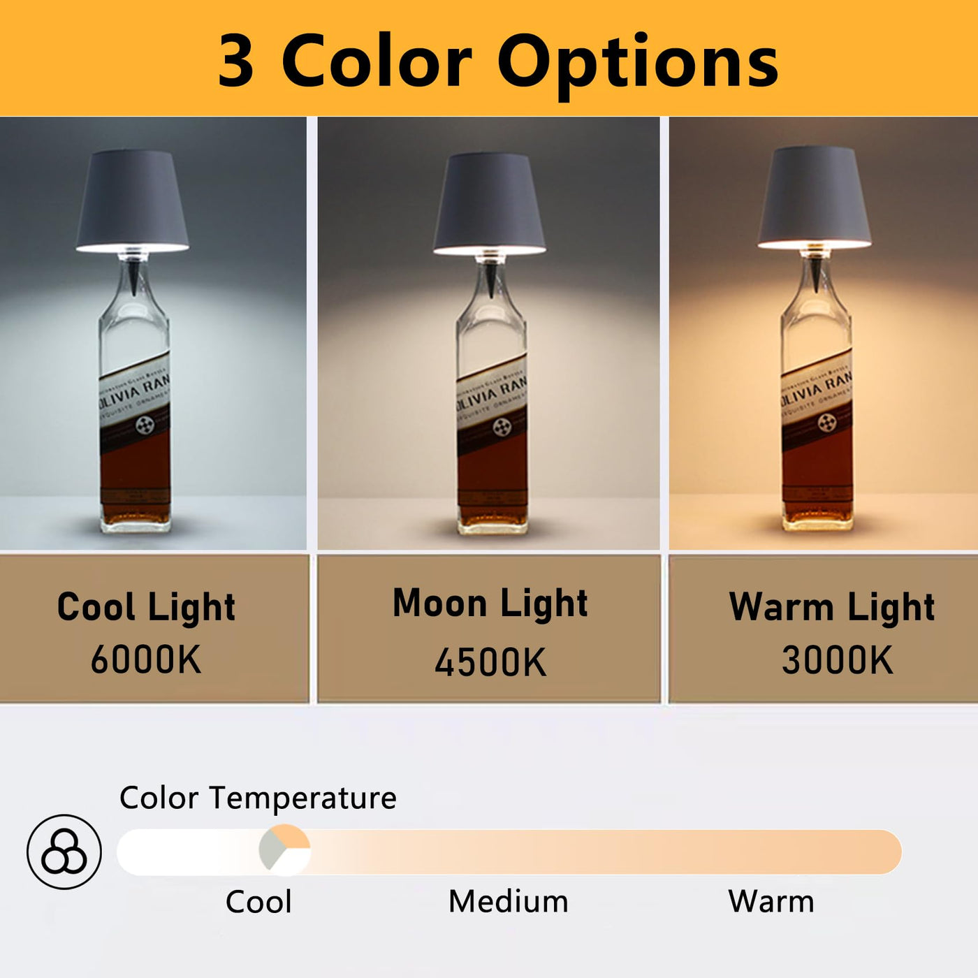 Q: What color lighting options are available with this lamp?A: The Bomvabe LED Wine Bottle Light offers customizable lighting with three different color options: Warm light, Moon light, and Cool light, allowing you to set the perfect ambiance for any occasion.