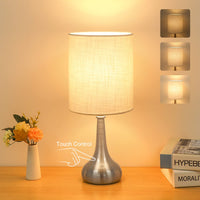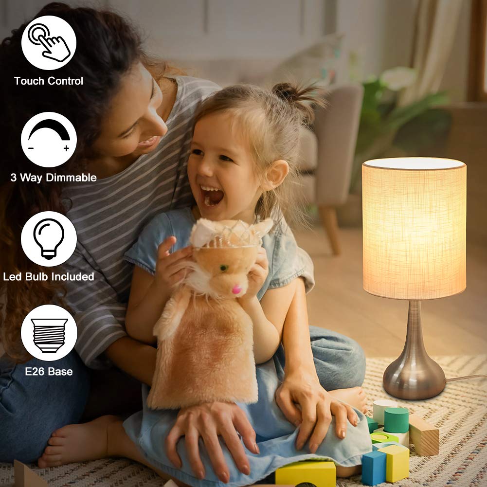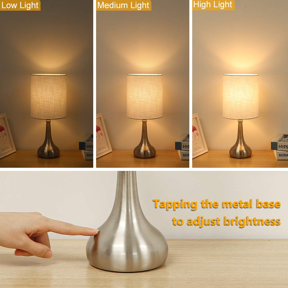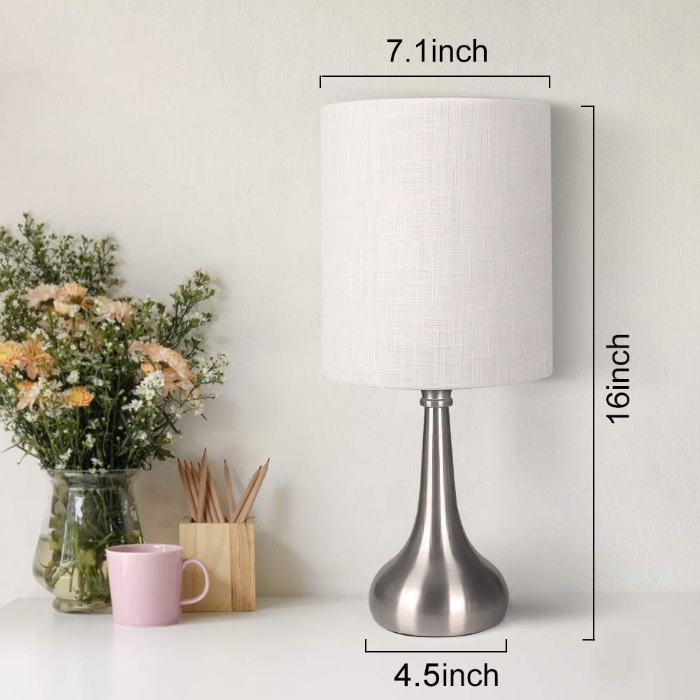 Boncoo 3-Way Dimmable Touch Control Table Lamp - Silver Metal Base, White Lampshade, Small Bedside Light for Bedroom, Office, A19 9W Bulb Included