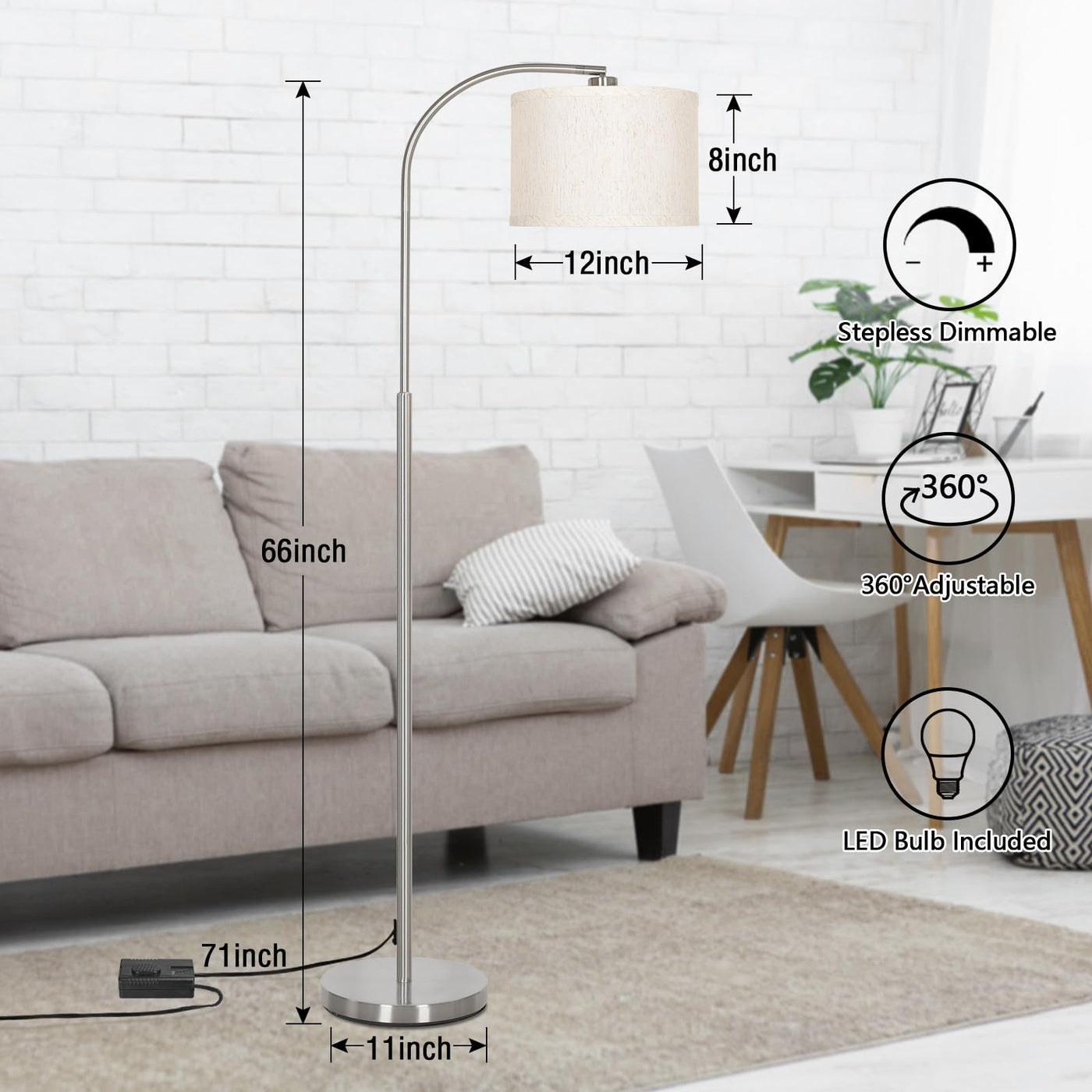 Q: What makes the Boncoo Arc Floor Lamp suitable for different interior styles?A: The Boncoo Arc Floor Lamp features a classic design with a beige linen lampshade and a sleek metal silver finish, allowing it to blend seamlessly with various interior styles including modern, traditional, antique, and minimalist decor.