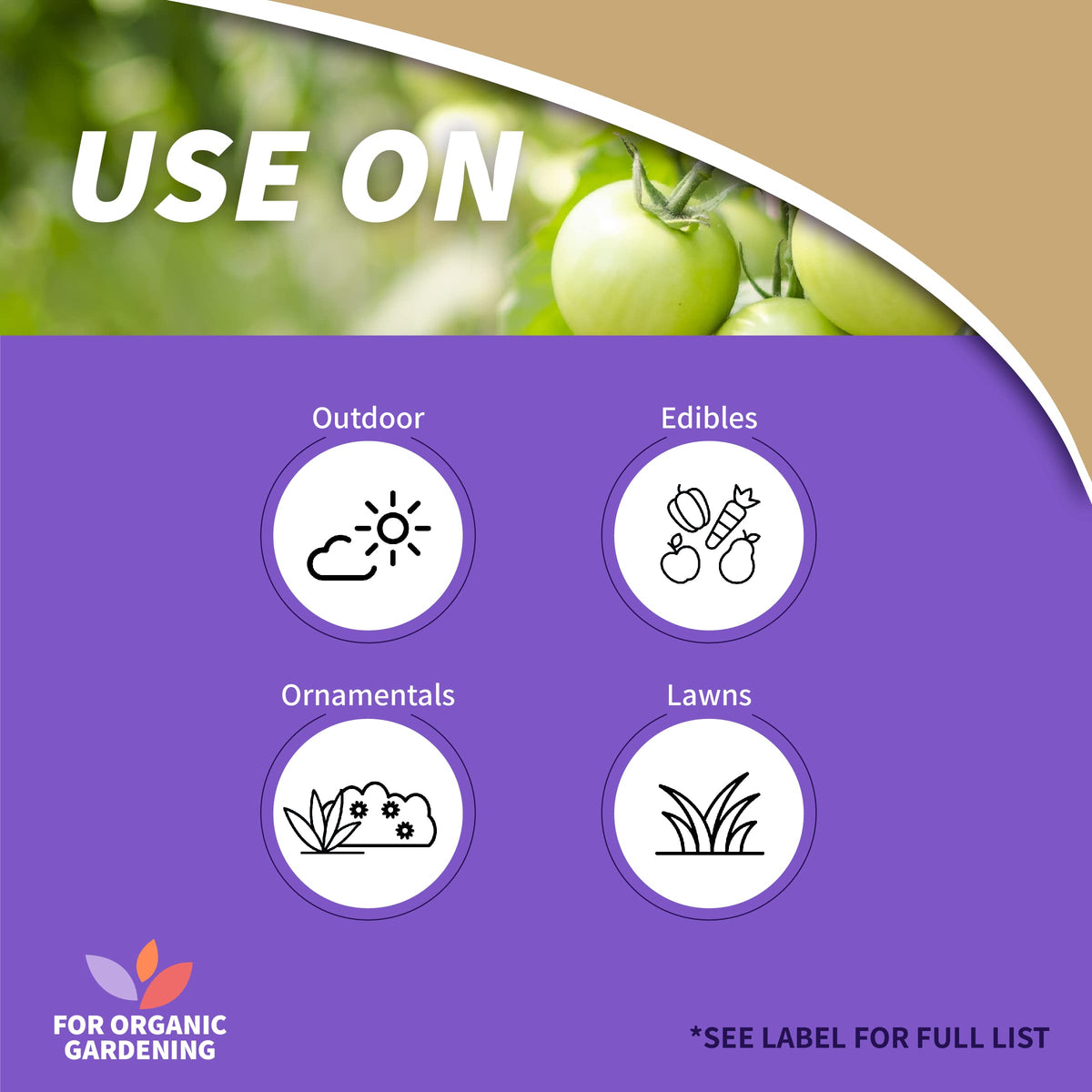 OUTDOOR USE: Formulated for outdoor residential use, this product is perfect for home gardens, lawns, ornamentals, and greenhouses. It is safe to use on a wide array of plants such as artichoke, cabbage, onions, berries, basil, lavender, mint, sage, pistachios, almonds, apples, plums, cilantro, and turf.