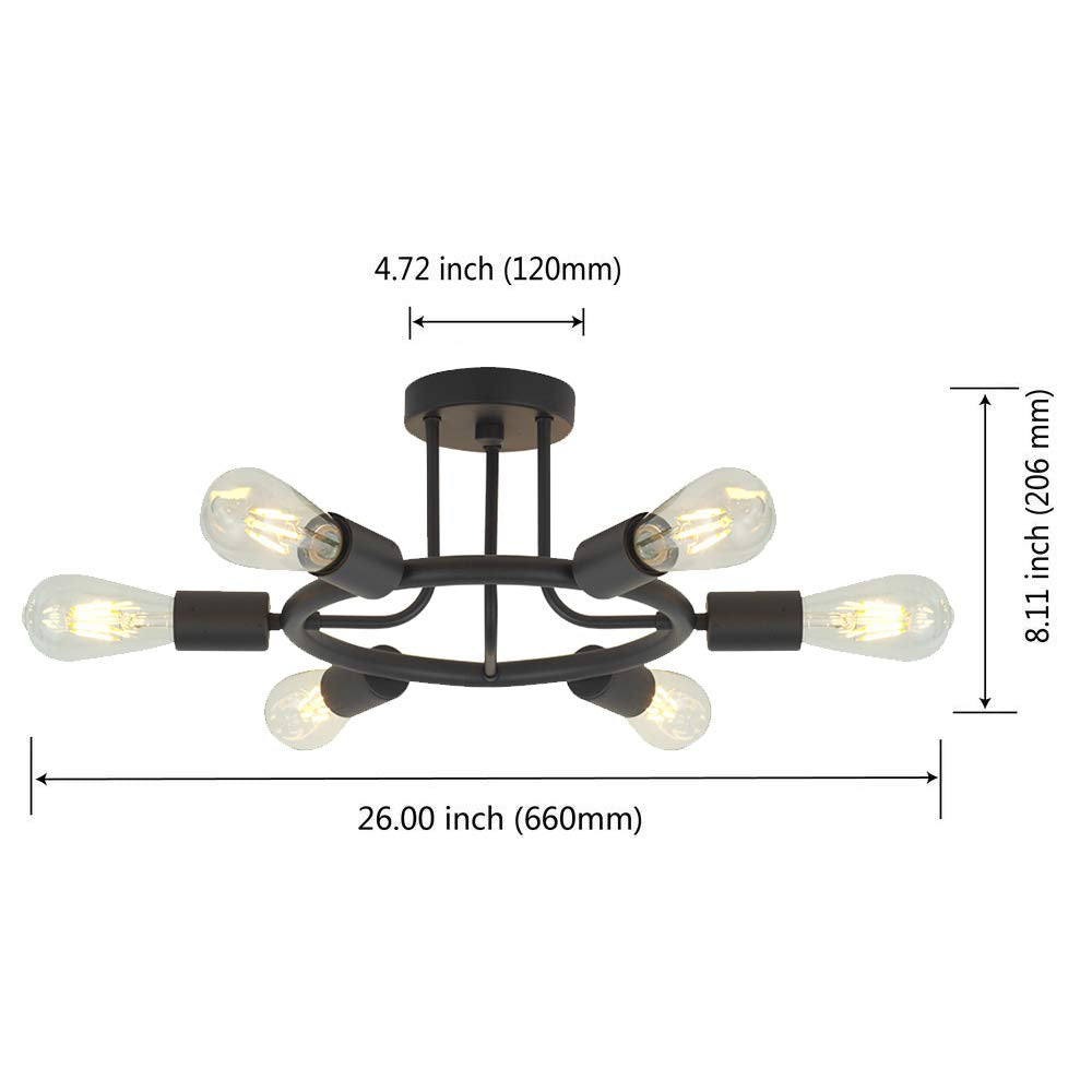 Q: What is the overall size of the BONLICHT chandelier?A: The BONLICHT 6 Lights Sputnik Chandelier is designed as a semi-flush mount fixture, which allows it to fit comfortably in spaces with lower ceilings while providing ample lighting.