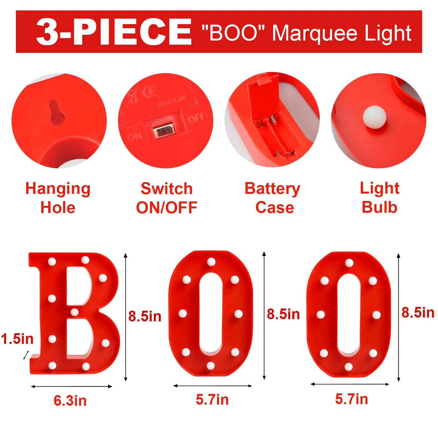 < b >FRESHEN YOUR HOME OR PARTY UP WITH THESE HALLOWEEN DECORATIONS!< /b > < br >< br >< b >Features:< /b > < br >The Halloween letter lights are made of premium plastic material.< br >Operated by 6 AA batteries (not included), the LED letters emit soft and warm white light and support for long-term use without overheating.< br >Equipped with an on/off switch and two hanging holes on the back of each light letter, you can easily hang LED letters on the walls, doors, or windows.< br >Halloween LED letter lights can be widely used in Fall party decoration, home, bedroom, mantel, table, wall, fireplace, bookshelf, etc. Great gift for kids, friends and family.< br >< br >< b >Product Specifications:< /b > < br >< b >Material:< /b > plastic material< br > < b >Size:< /b > < br > Letter light ''B''(8.5*6.3*1.5in)< br >Letter light ''O''(8.5*5.7*1.5in)< br > < b >Color: < /b >Red< br >< b >Style:< /b > Halloween style< br >< br >< b > Halloween Decorations for home Includes:< /b > < br >3 x Halloween Letter Lights< b >