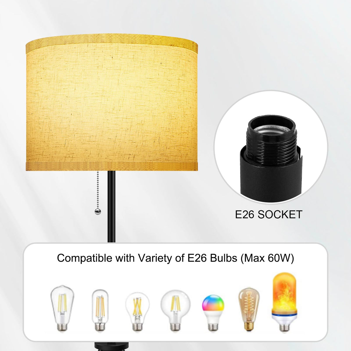 Q: What type of bulbs can I use with the BoostArea Floor Lamp?A: The BoostArea Floor Lamp is compatible with any E26 standard base bulbs, allowing you to use LED, CFL, incandescent, or halogen bulbs with a maximum wattage of 60W. Please note that bulbs are not included with the lamp.