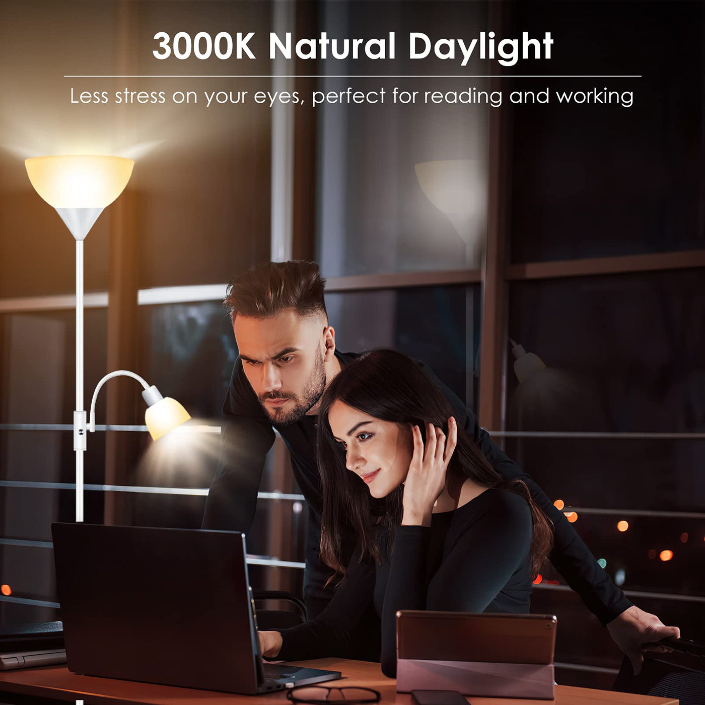 Eco-friendly LED Bulbs The bright floor lamp adopt energy-saving LED bulbs with a 50,000 hours lifespan Also, the integrated LED bulbs (Not replaceable) of the standing lamp keep a cool touch even after hours of use gooseneck Reading L BoostArea floor lamp comes with a 9W Main Lamp and a 4W Side Lamp, the adjustable gooseneck of the side lamp allows you to adjust the angles to illuminate your projects, like reading, working and daily use By emitting 3000K warm white light, the Eye-caring LED floor lamp will not harm your eyes Also, with the three options of the rotary switch, you can choose the Main Lamp On, Side Lamp On, or Both Lamp On according to different task needs Safe and Easy Assembly We take safety seriously into consideration, with a stable base and metal pole, this tall floor lamp provides good stability from falling, which is safe for your baby and pet Simple and easy to assemble within 5 mins without extra tools, you just need to screw all the parts of the LED floor lamp together Thanks for the space-saving design, the standing lamp can fit easily in any corner of the room, slide it behind a sofa or place it beside a cabinet, you can move it easily into various places in your home Besides, its modern design makes it not only floor lamps for bedrooms, living room or office, but also a nice decoration for your home The standing floor lamp fits well with urban, mid-century modern, casual or contemporary decor compatible with smart devices You can plug this floor lamp in the smart plug (not included), or connect it to a wall switch (not included) Add the floor lamp to your home appliances group choose our modern white floor lamp, led floor lamp, mother-daughter floor lamp, floor lamps for bedrooms, kids floor lamp, dorm room floor lamp, pole floor lamps for living room, pole lamp, office lighting, room lamp, room light, floor lamps for living room bright lighting, floor lamps for living room clearance, and add a warm touch of your sweet home