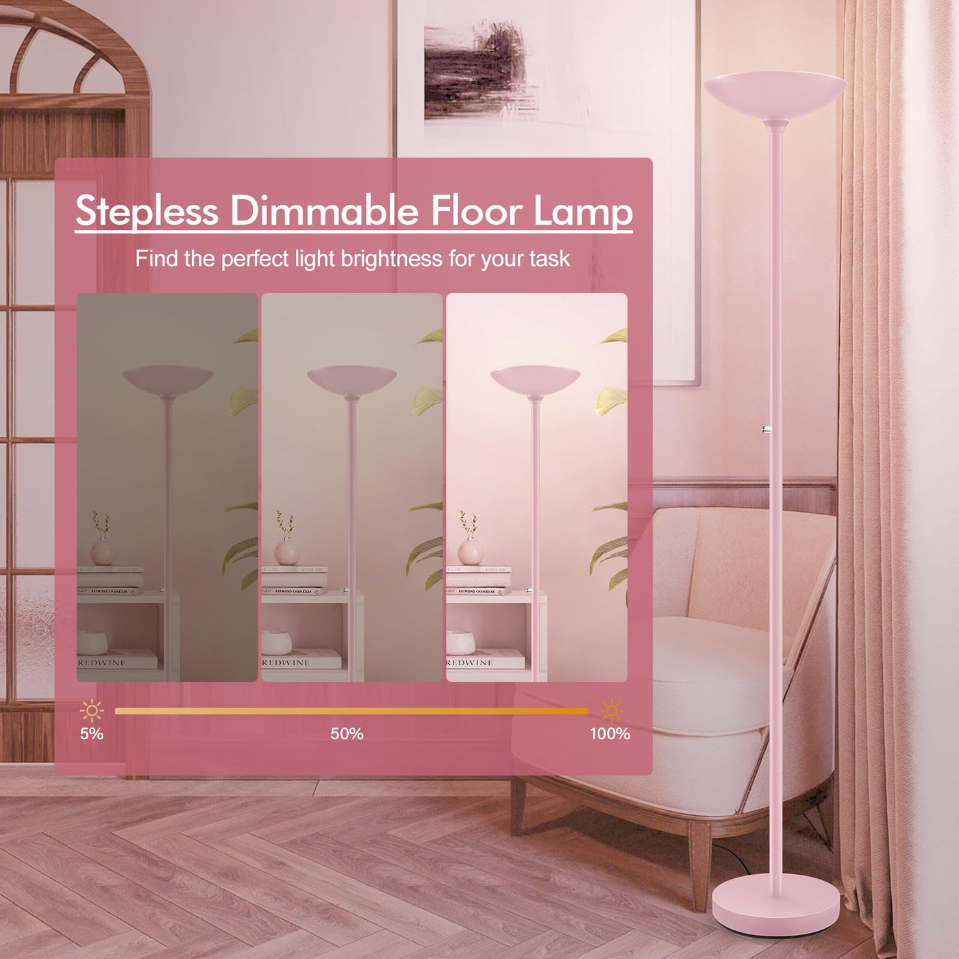 3000K Stepless Dimming; Turn On/Off, Adjust Brightness, All The Operations Can Be Achieved By A Rotary Switch; The Skinny Pink Floor Lamp Can Emit Up To 3600Lm And 3000K Natural Daylight, Which Is Bright Enough For A Regular Living Room; You Can Choose The Proper Brightness For Scenarios; Bright Light For The Working Or Reading, Dim Mood Light For Preparing A Romantic Dinner For Your Loved One; Besides, The Standing Lamps Will Remember And Return To Your Last Light Setting When You Turn On Again Long Lifespan With Energy-Saving Led Light; Boostarea Producing Sustainable Products To Practice Our Social Responsibility; All Our Floor Lamps Adopt Led Beads Which Are Known For Their High Efficiency, Low Power Consumption, And Environment Friendly; With 24 Watts And 2400 Lumens(Equals To A 200W Incandescent Lamp), This Led Floor Lamp Costs 90% Less Than Incandescent Lamps Cost; This Standing Lamp Will Save You Electricity Bills As Well As Money And Time For Maintenance Metal Material And Safe; From The Lampshade To The Base, This Led Floor Lamp Is Made Of Premium Metal; Simply Designed, But Sturdy And Practical; With A Heavy Base, This Torchiere Floor Lamp Stands Steadily And Won'T Tip Over Easily; The Metal Lampshade Is Also A Touch Of Modern Industrial Style Designed; And You Don'T Have To Worry About The Overheating Problem Since This Torchiere Floor Lamp Adopts A Led Bulb That Will Stay Cold Easy Assembly; Thanks To Our Designer Years' Work Of Improving The Structure, We Make The Assembly Easy Than Ever; Without Tools Required, You Just Need To Screw All The Parts Of The Lamp Pole Together To Finish The Assembly Of This Torchiere Floor Lamp; Ps. The Instruction Is Included In The Package And The Assembly Video Is Attached To The Product Page Compatible With Smart Devices; You Can Plug This Floor Lamp In The Smart Plug (Not Included), Or Connect It To A Wall Switch (Not Included); Add The Floor Lamp To Your Home Appliances Group, And Easily Controlled It By Your Phone.