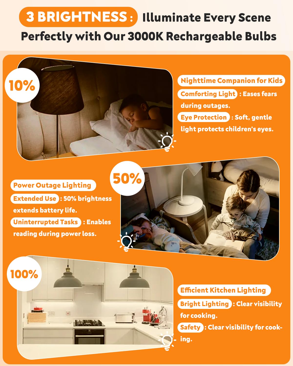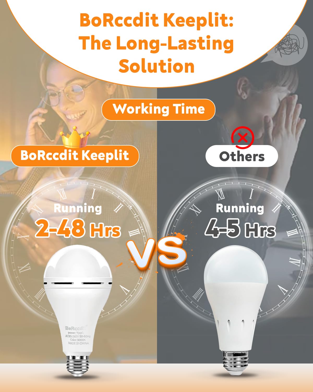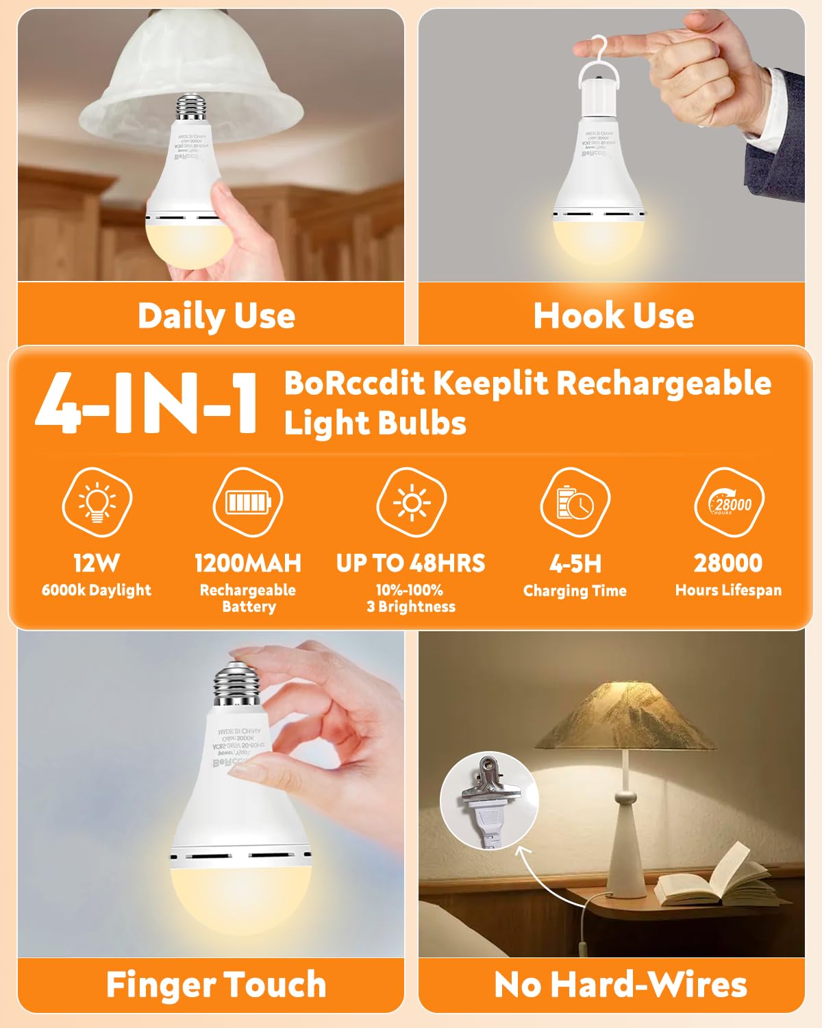 Borccdit Keeplit 8 Pack Emergency Rechargeable Light Bulbs, 48H Long Lasting & 3 Brightness Power Outage Lights,12W 3000K Batter