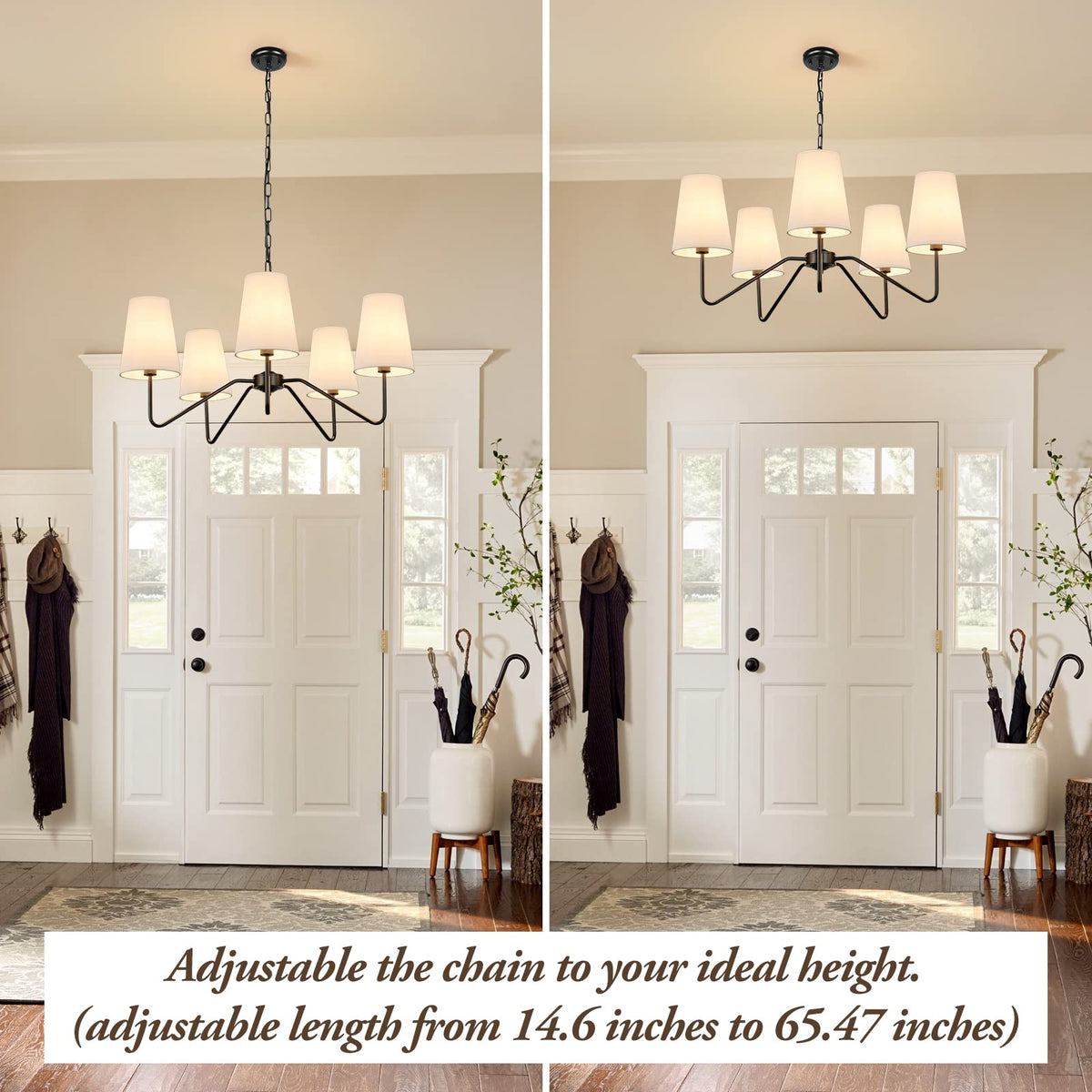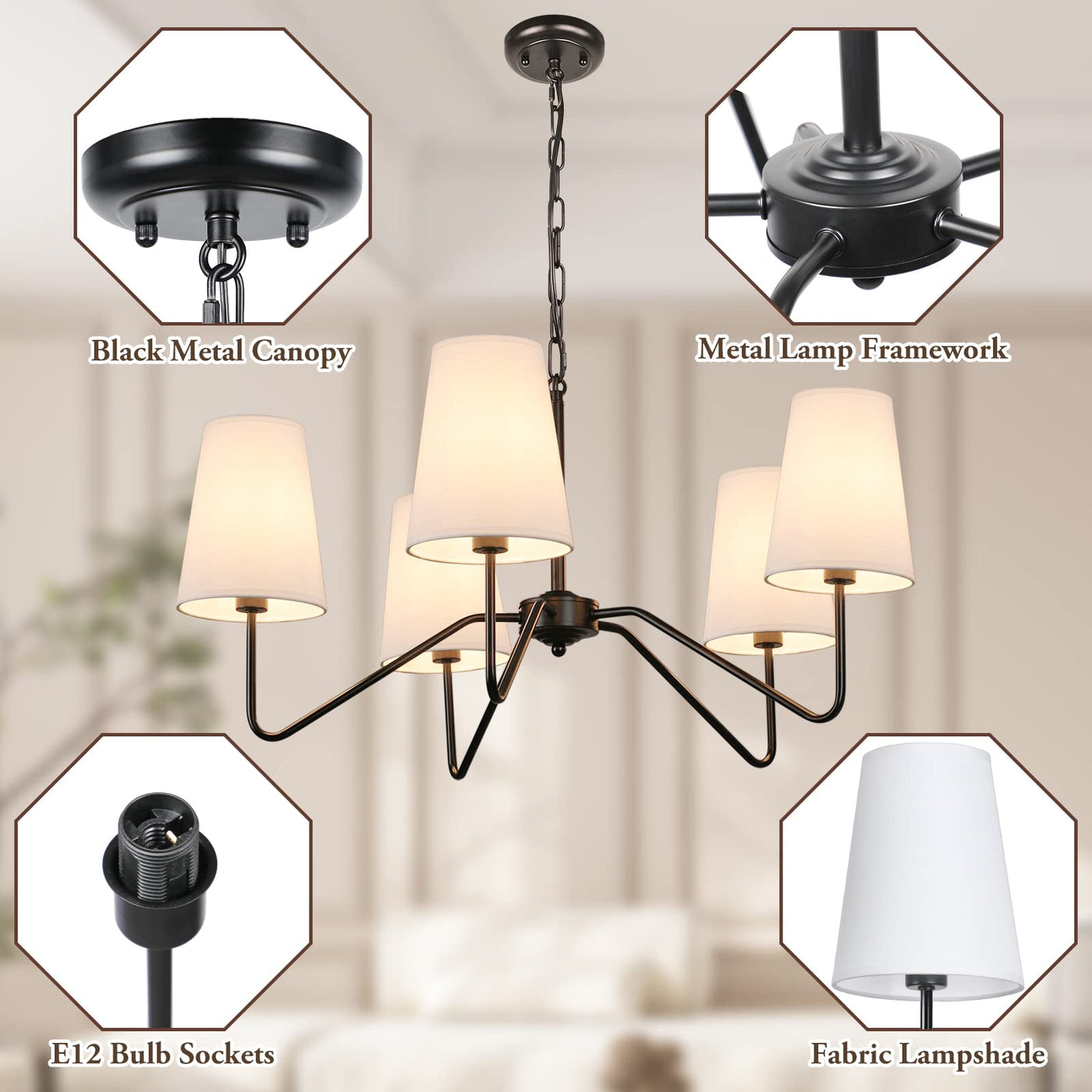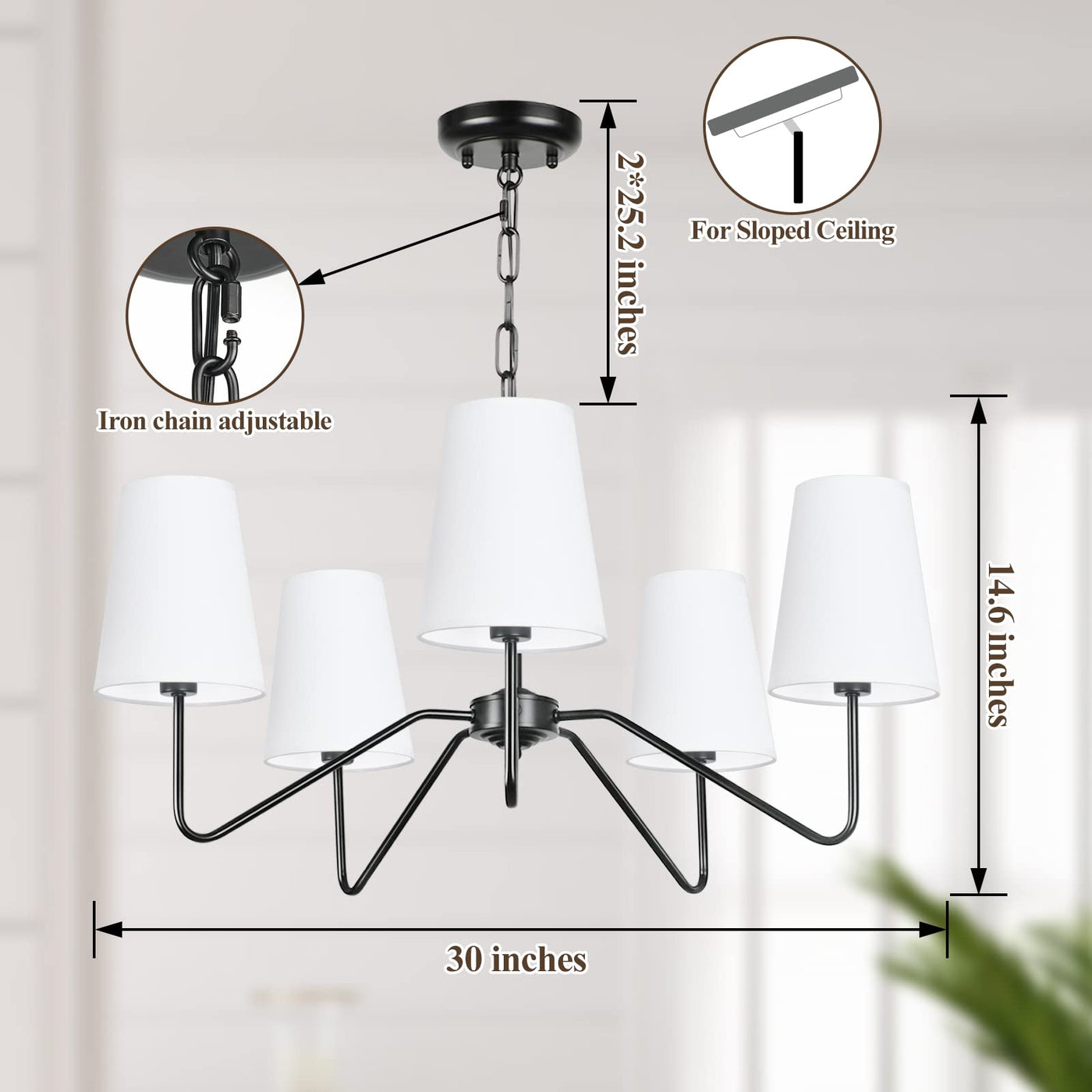 - **Stylish & Modern Design**: Featuring five elegant curved arms and classic white fabric shades, this chandelier embodies a clean, minimalistic aesthetic that brings a touch of modern chic to your home décor. The sleek matte black finish complements a variety of interior styles, making it a versatile addition to any space.