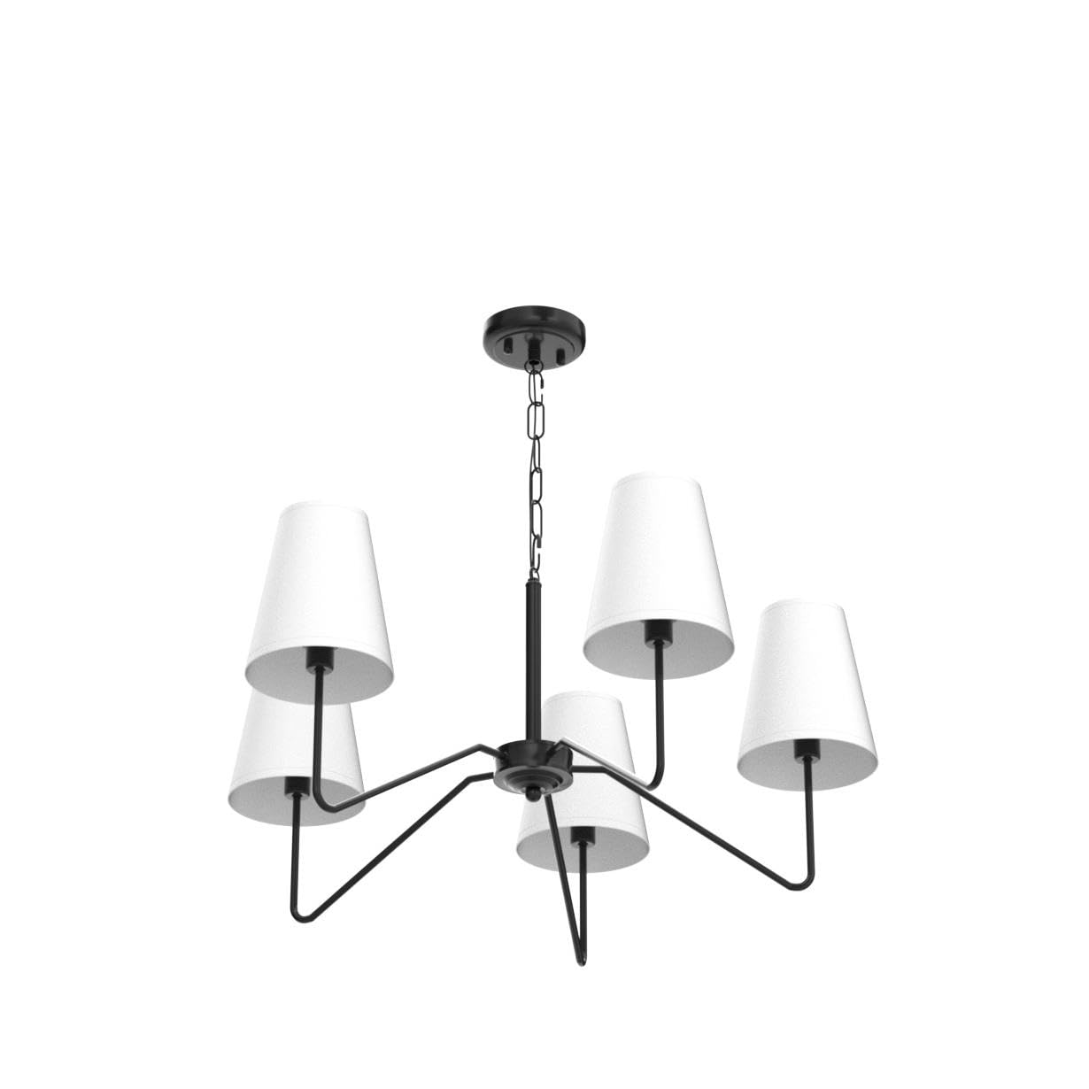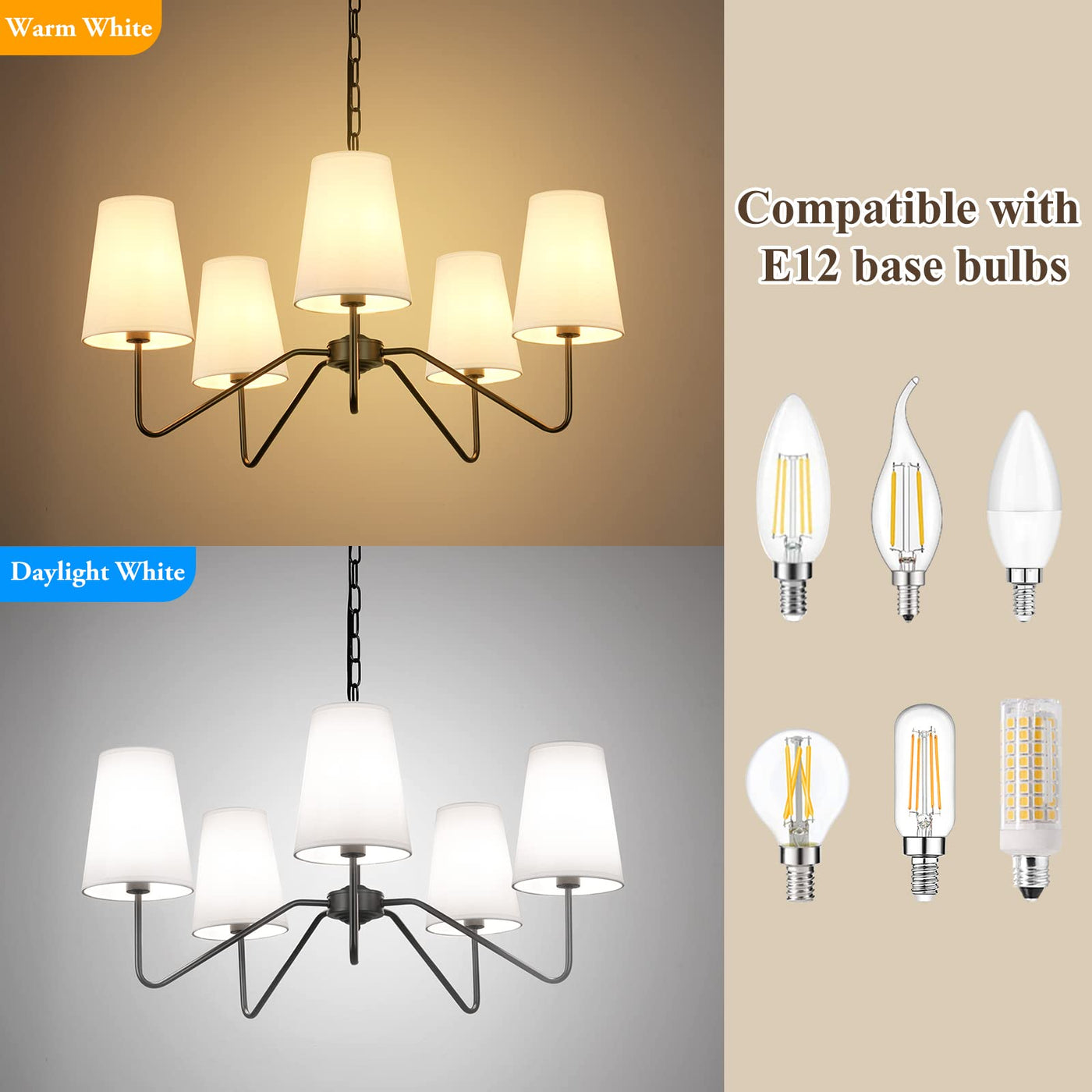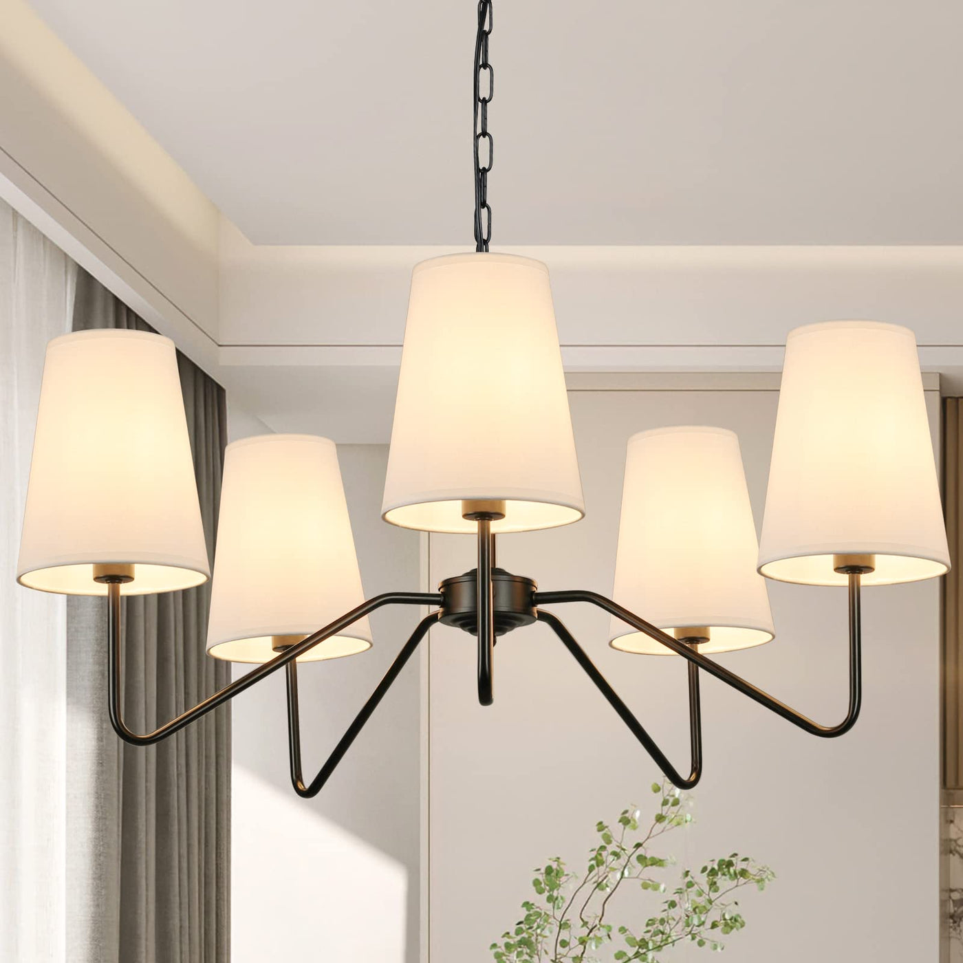 - **Stylish & Modern Design**: Featuring five elegant curved arms and classic white fabric shades, this chandelier embodies a clean, minimalistic aesthetic that brings a touch of modern chic to your home décor. The sleek matte black finish complements a variety of interior styles, making it a versatile addition to any space.