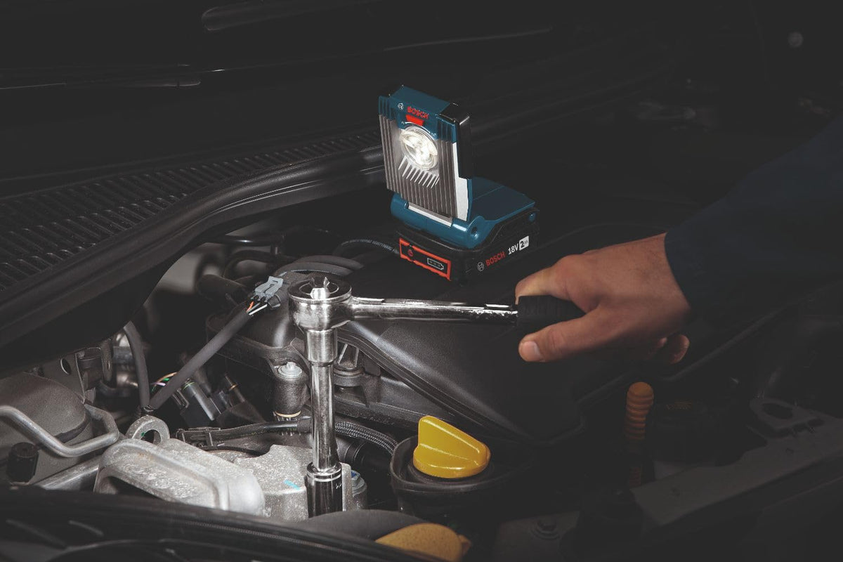 The Bosch Gli18V-420B 18V Led Worklight Provides The Brightest Worklight (420 Lm) In Its Class, With Three Dynamic, Innovative Leds. The Gli18V-420 Provides A Dial To Adjust The Light Diffusion. Users Are Able To Shine A High-Intensity Spotlight On A Specific Are Where They Need It. Or They Can Turn The Dial For A Diffuse Flood Light To Brighten A Larger Area. Its Swiveling Stand And A Hard Rubber Mounting Strap Provides Countless Ways Of Positioning And Directing The Light, To Illuminate Any Hard-To-Reach Work Area. It Boasts An Extreme Runtime, And, Depending On The Battery Capacity, Can Run Up To 13.5 Hours On A 6 Ah 18V Battery (Not Included). The Unit Is Extremely Robust, Due To Its Tough Housing And Aluminum Heat Sink.