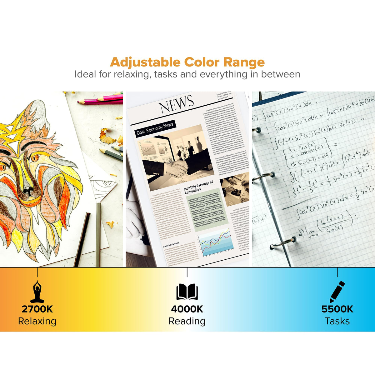 Q: Does the desk lamp have adjustable color temperature settings?A: Yes, this desk lamp features adjustable color temperature modes, ranging from relaxing warm white to energizing cool white, providing versatility for different activities and times of the day.