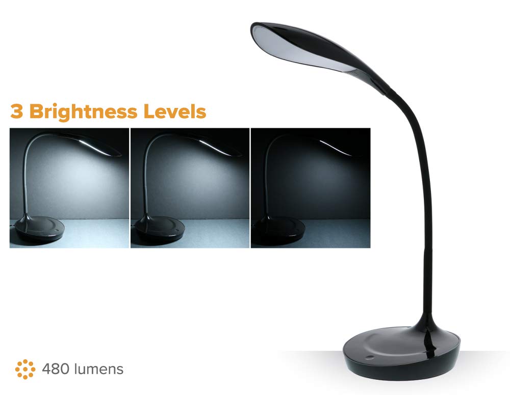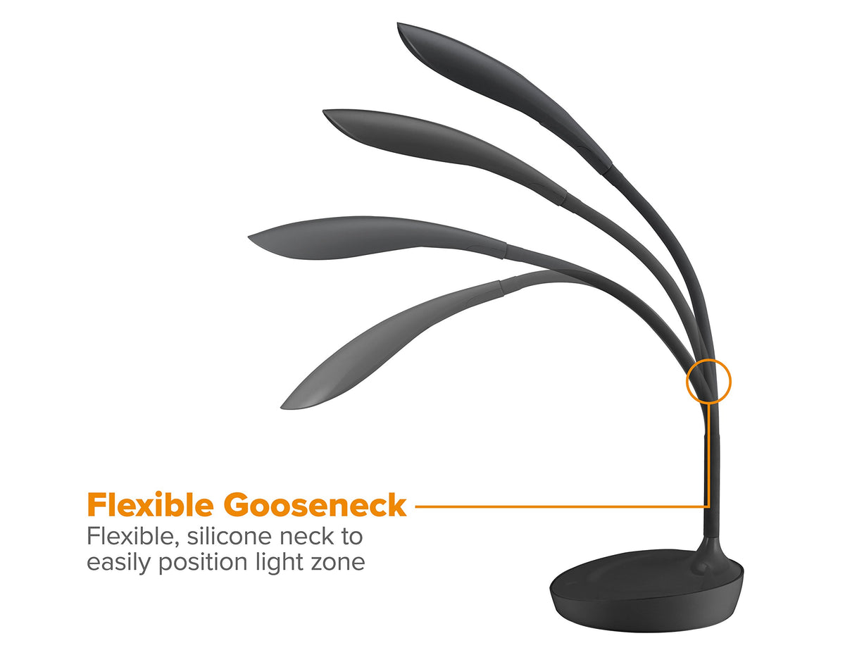 Brighten your mood and office with this connector Gooseneck LED desk lamp! it operates off of touch sensitive power control for easy use. Adjust the brightness using the dimmer function so you always have the perfect amount of illumination. The silicone neck is super flexible to conveniently position the light to exactly where you need it. Our favorite feature there's an integrated USB port for in-unit charging of your phone, watch or tablet. With a simple and clean aesthetic, you can do no wrong with this LED desk lamp. It requires 85% less energy than incandescent lamps. Available in colors to match the Bostitch connector office organization line. Features: integrated USB port flexible, silicone neck - three brightness levels via dimmer function touch power controls flicker-free + cost-efficient- available in four colors to match the Konnect line.