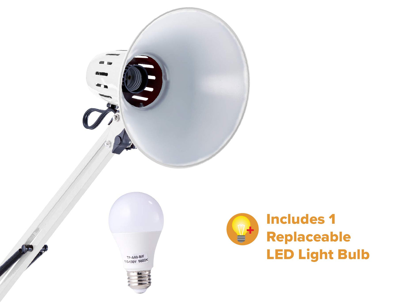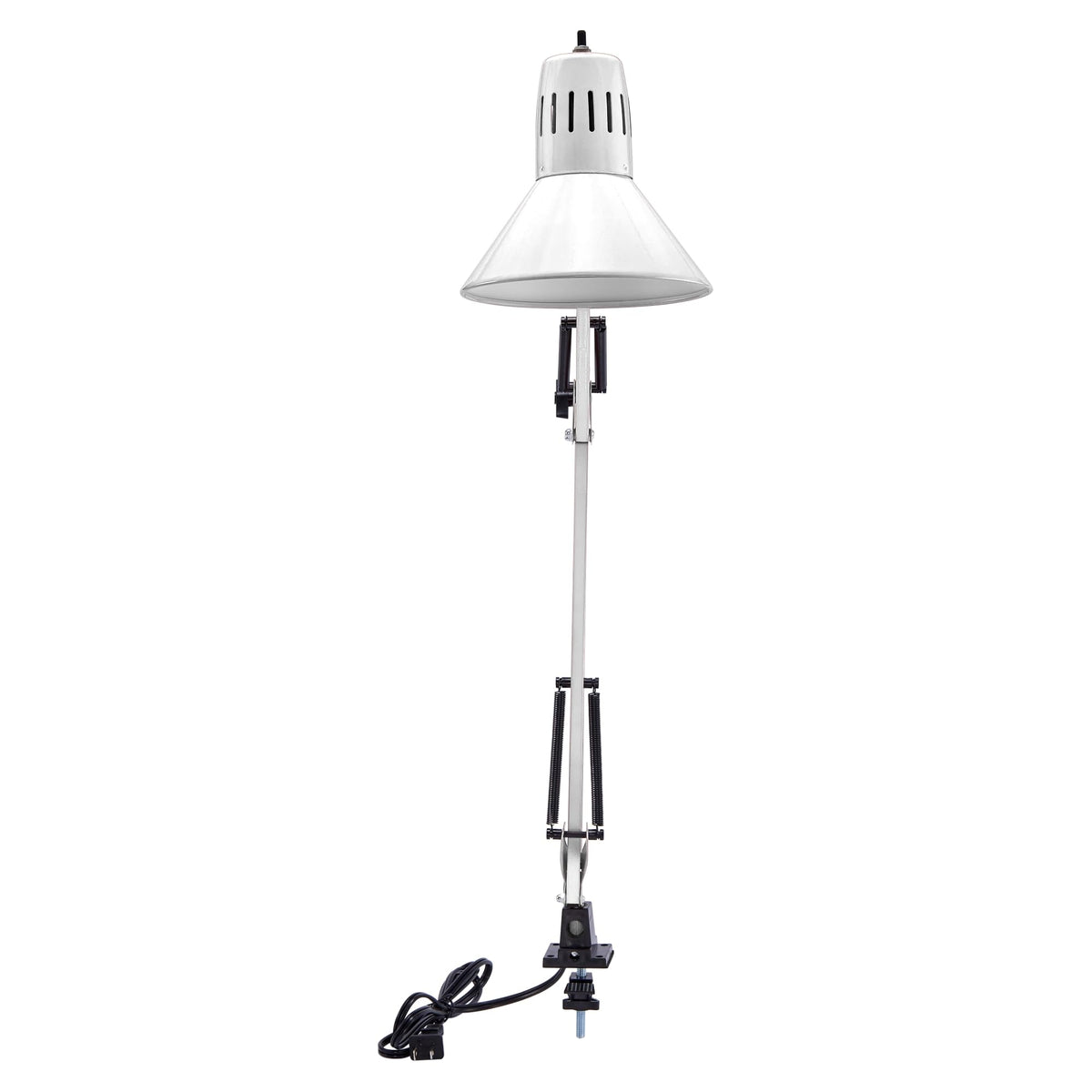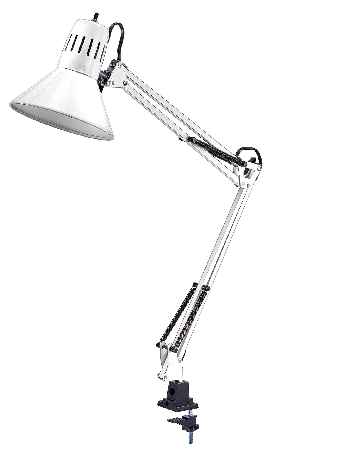 While this Bostitch adjustable swing arm desk white lamp may not have an ordinary base, it features a fully functional and versatile clip on base! It has a clamp at the bottom to easily mount or attach it to your desk, workbench or table's edge. The long, multi-joint arm allows this clamp on desk lamp to reach 36 inches high and adjusts to achieve any position. Whether you're looking for the perfect lamp for your home office, reading or study time or even for crafts, no surface goes unlit as this lamp easily clears monitors and large surface tops. Each clamp lamp has an all metal construction to provide durability and longevity. It even comes ready to use as it includes a replaceable LED light bulb for brilliant lighting in any room with the quick plug in at any electric outlet. This lamp takes on a minimalist, classic look, making it easy to incorporate it into any office, dorm or classroom.