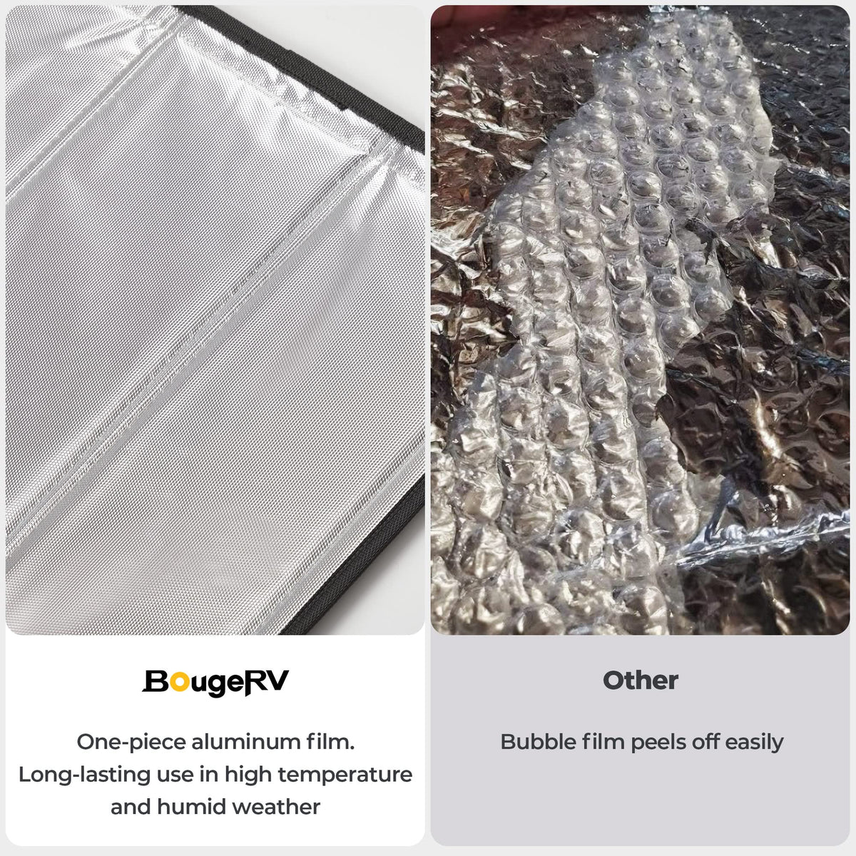 Q: What material is the BougeRV RV skylight cover made from?A: The BougeRV RV skylight cover is made from high-quality aluminum film, ensuring durability and effective insulation.