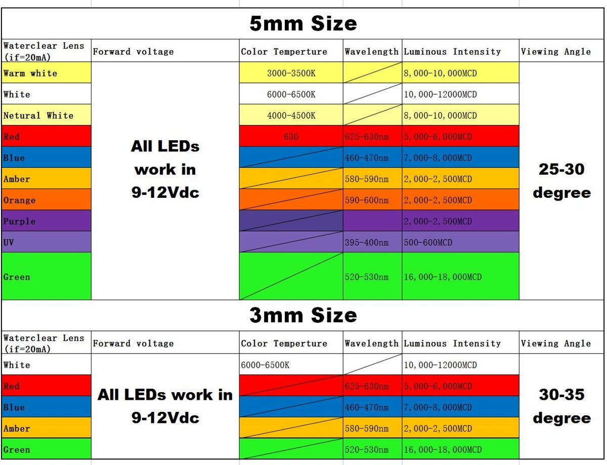 work in 9-12Volts Do not need add any resistor, it can work in 9-12Volts directly Specifications : -Size: T1 Round (waterclear) LED or 3mm Round (waterclear) LED Brightness: 10,000-12,000MCD -Emitting color:White. -Color temperture: 6000-6500K -Forward voltage:9V~12VDC Compatible. -Forward current Typical: 15mA or below; Max: 20mA -Viewing angle: 25-35 Degree- Applications & Installations Ideal for 9-12V LED replacement for computers, radio, dashboards, or any battery or power supply that the voltage in 9-12V .etc. Very low power consumption, and high luminous intensity Recommended voltage is 12V Package included : 100pcs T1 Round (waterclear) LED or 3mm Round (waterclear) LED(White) Search ''bowerful '' for more related leds;