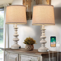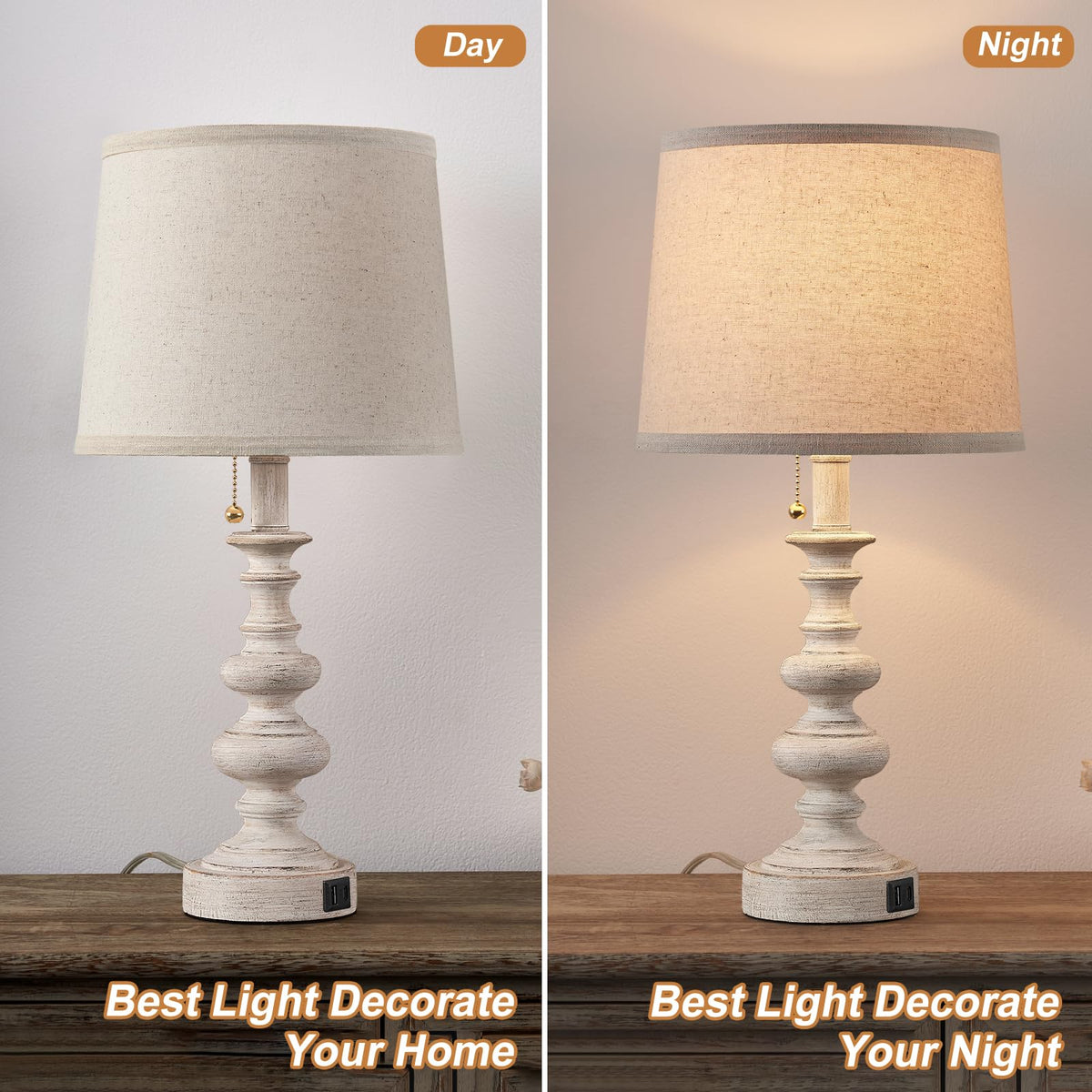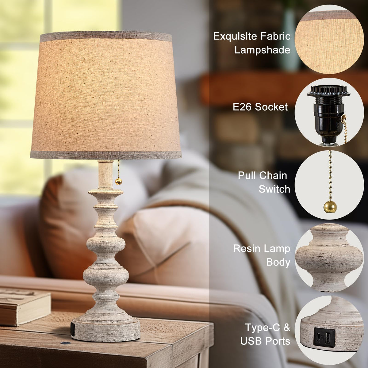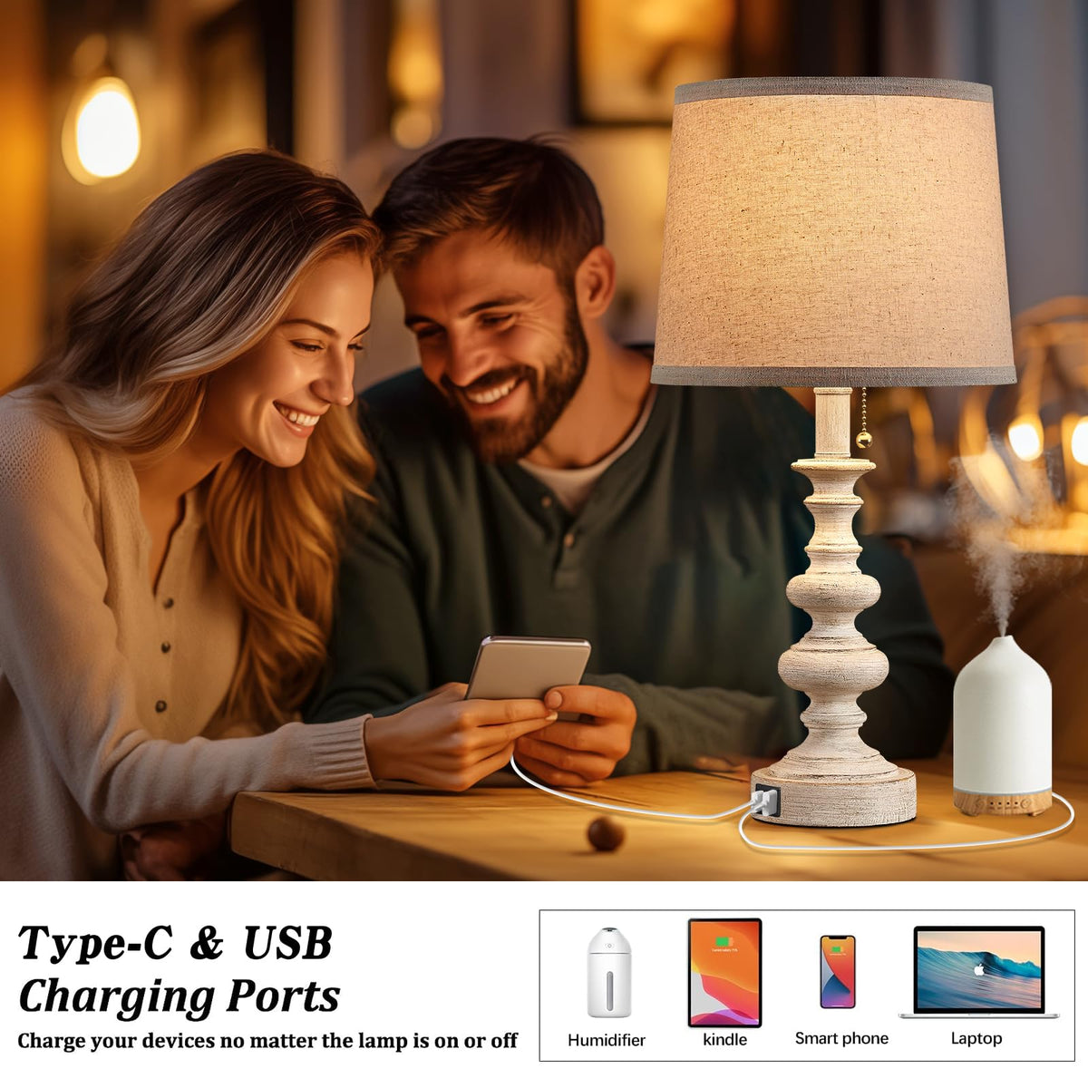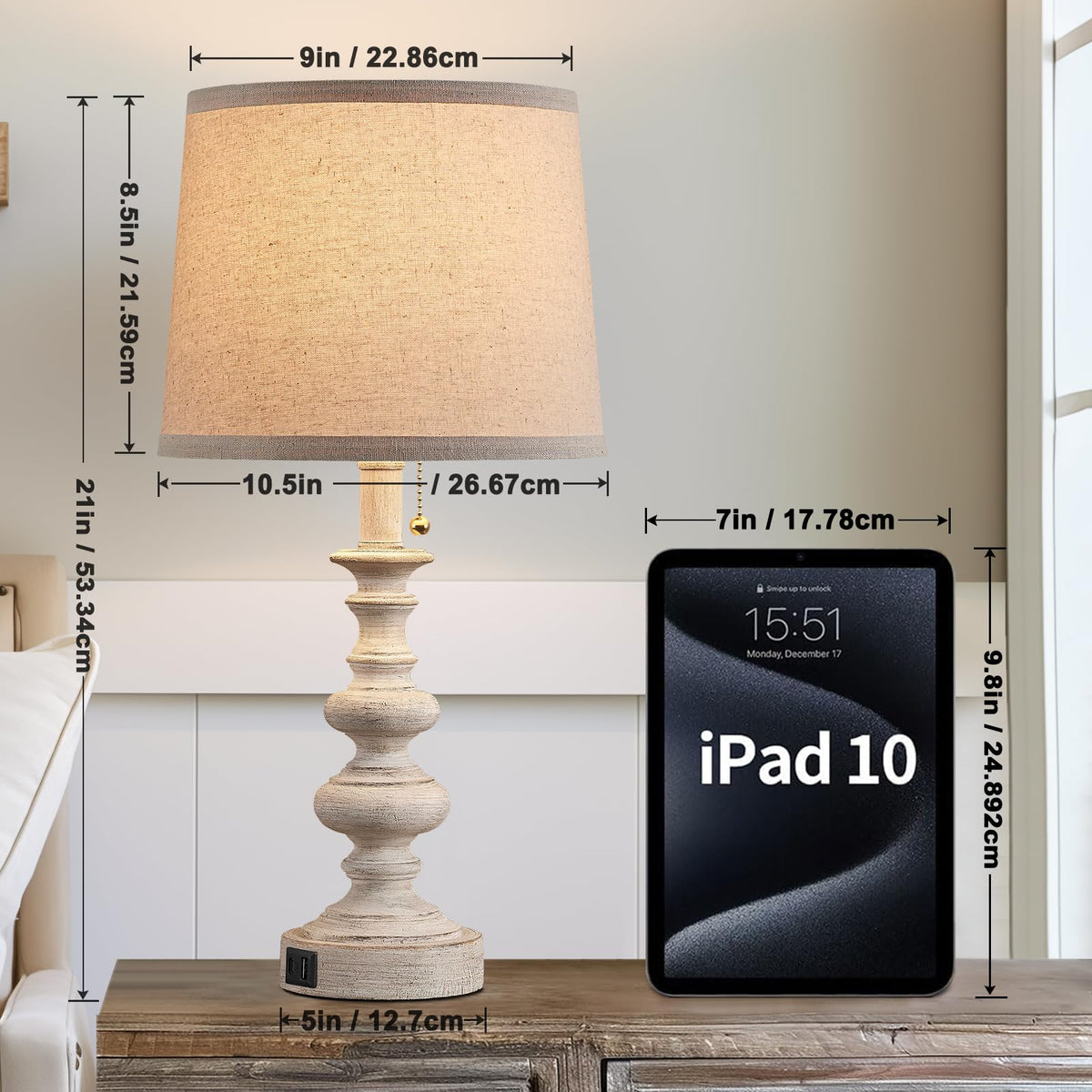 21'' Farmhouse Table Lamp Set Of 2 With Usb A+C Ports For Bedroom Living Room Vintage Rustic Traditional Nightstand Bedside Lamps Retro Side Table Lamps Pull Chain, Retro White