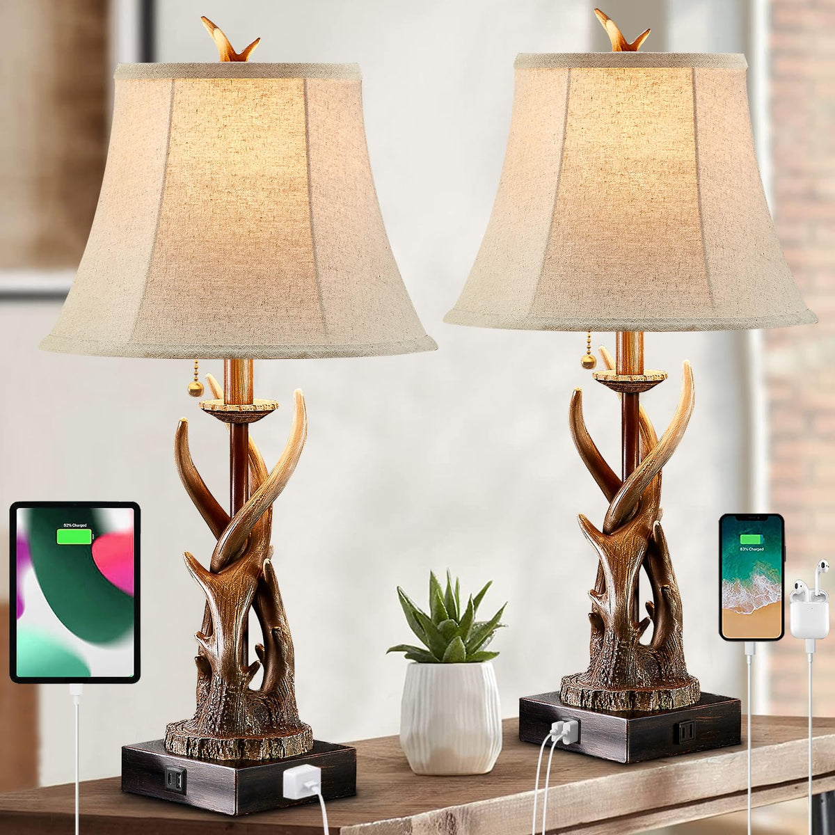 Bowobo Antler Table Lamps Set Of 2 With Usb A+C Ports For Bedroom Farmhouse Deer Rustic Bedside Lamps With Bell Shade For Living