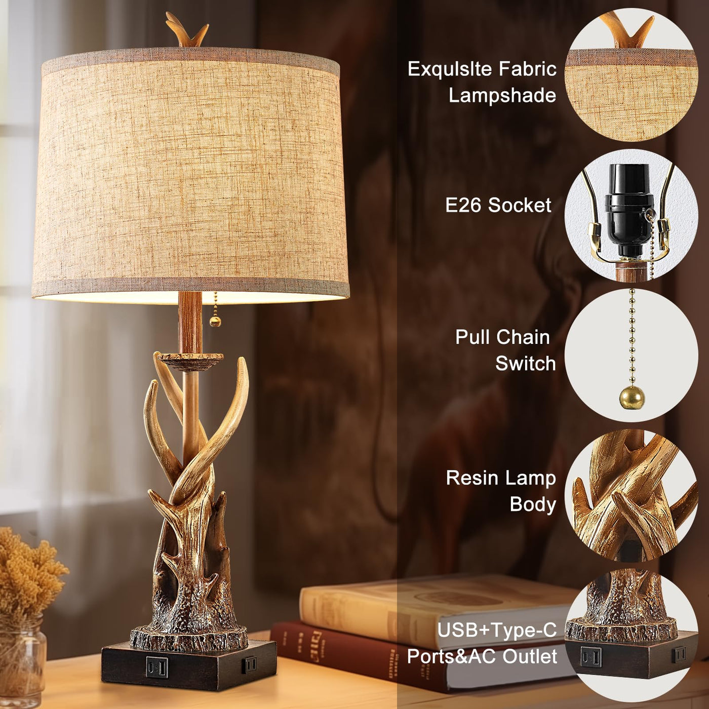 Bowobo Rustic Deer Antler Table Lamps Set Of 2 For Bedroom Farmhouse Bedside Lamps With Usb A+C Ports For Living Room End Table