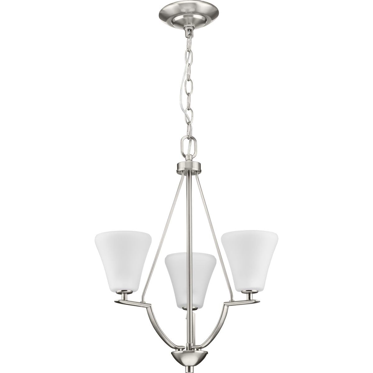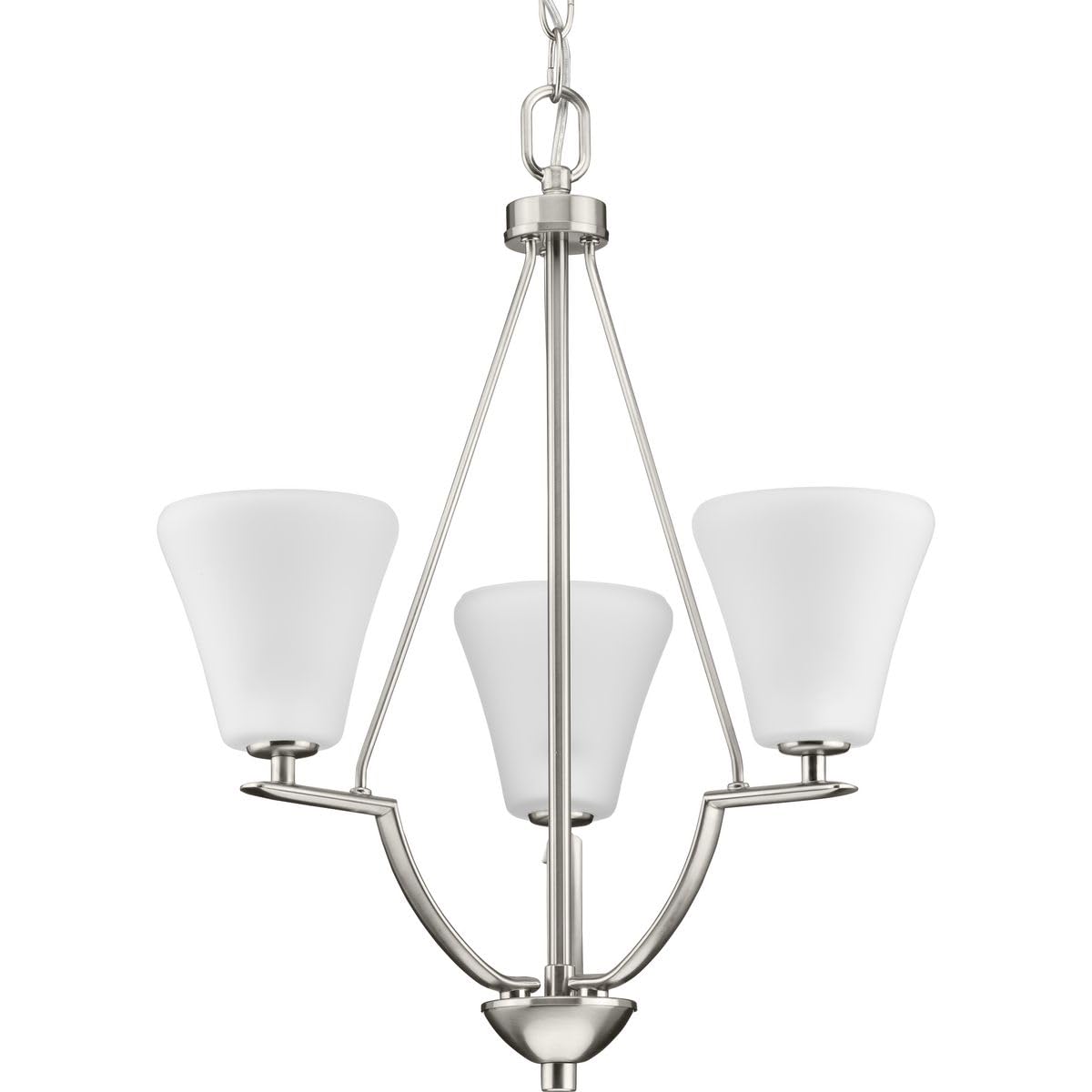 Three-Light Chandelier/Foyer With White Etched Glass From The Bravo Collection. Linear Elements Stream Throughout The Fixture To Compose A Relaxed But Exotic Ambiance. Generously Scaled Glass Shades Add Distinction Against The Brushed Nickel Finish And Provide Pleasing Illumination To Your Room. Six Feet Of 9 Gauge Chain Is Supplied For Ceiling Chain Mount. Bravo Possesses A Smart Simplicity To Complement Today'S Home Entirely With Confidence And Style.