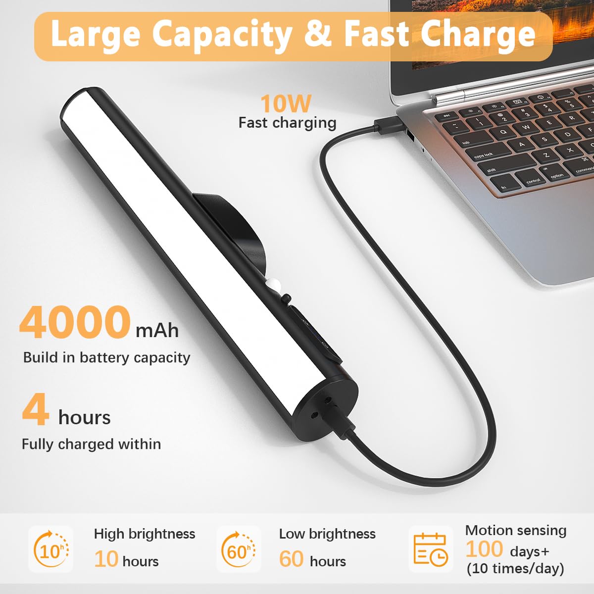 Q: How long does the battery last on a single charge?A: The 4000mAh USB rechargeable battery of the bravzurg LED light bar can last between 10 to 60 hours in always-on mode and can operate for over 100 days in motion sensor mode, making it ideal for long-term use without frequent recharging.