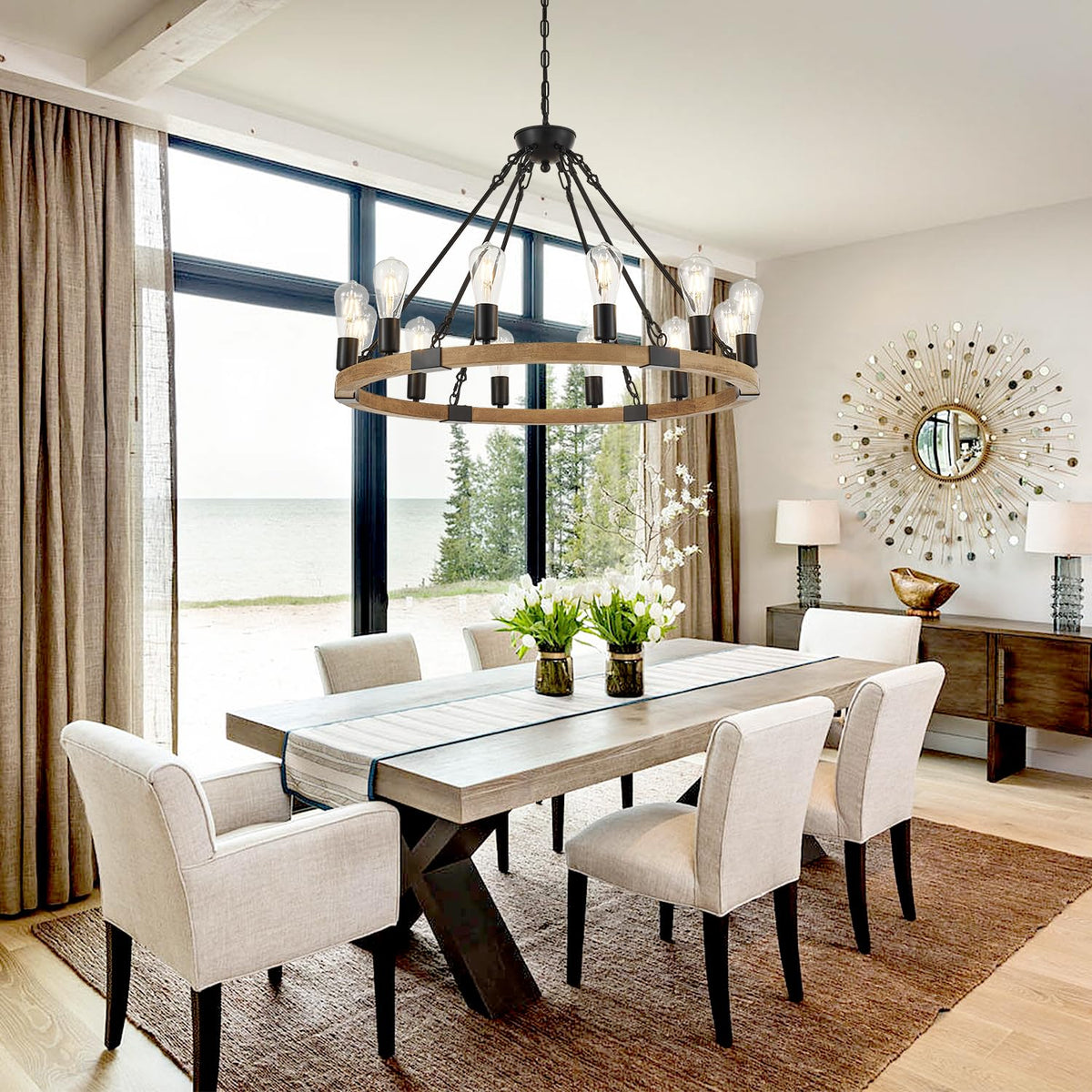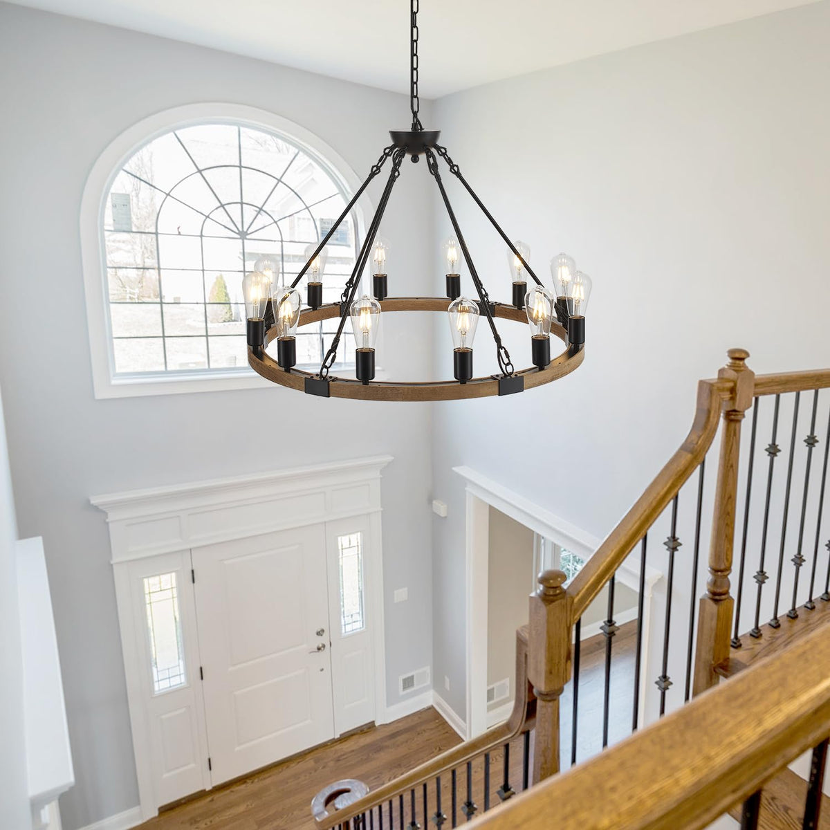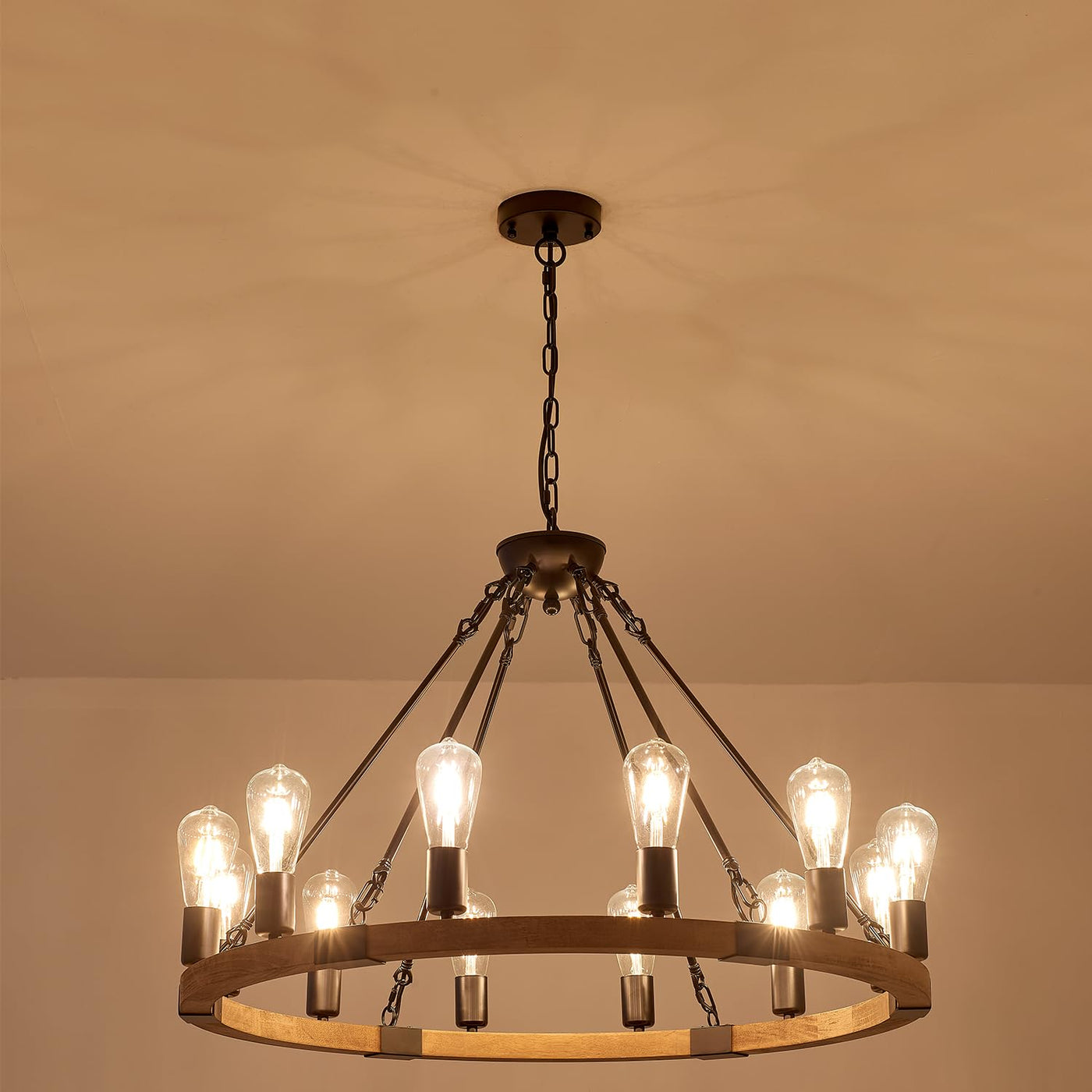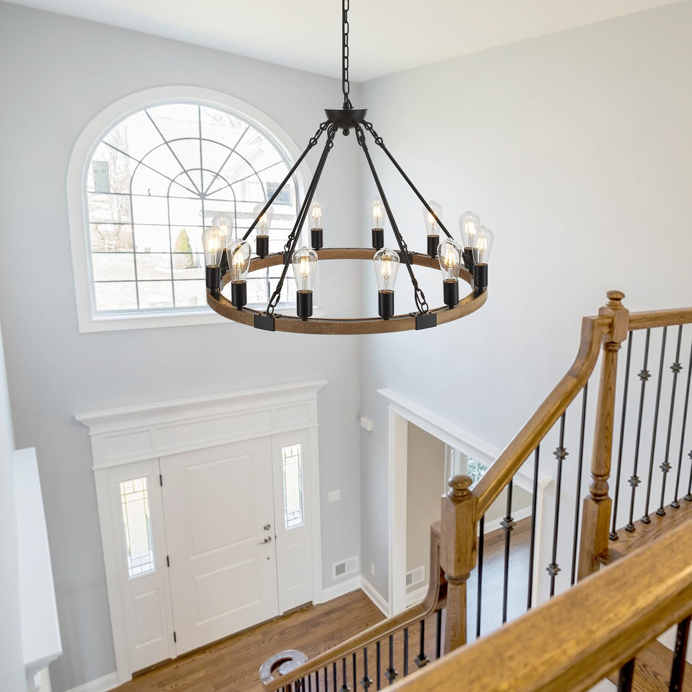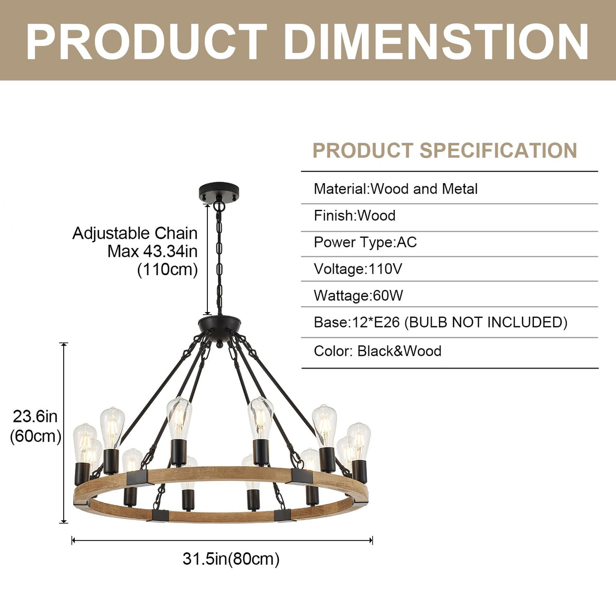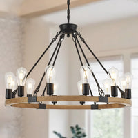 Brfaixla 12-Light 31.5'' Wooden Wagon Wheel Chandelier Natural Farmhouse, Rustic Black Metal Ceiling Pendant Chandelier Vintage