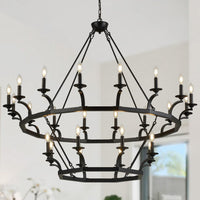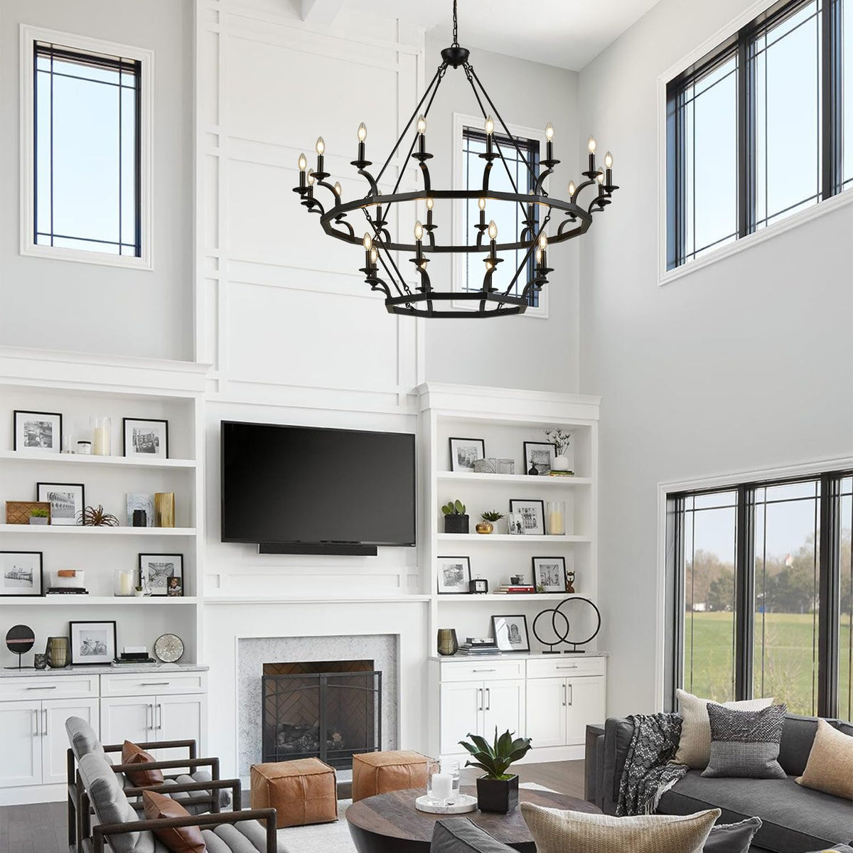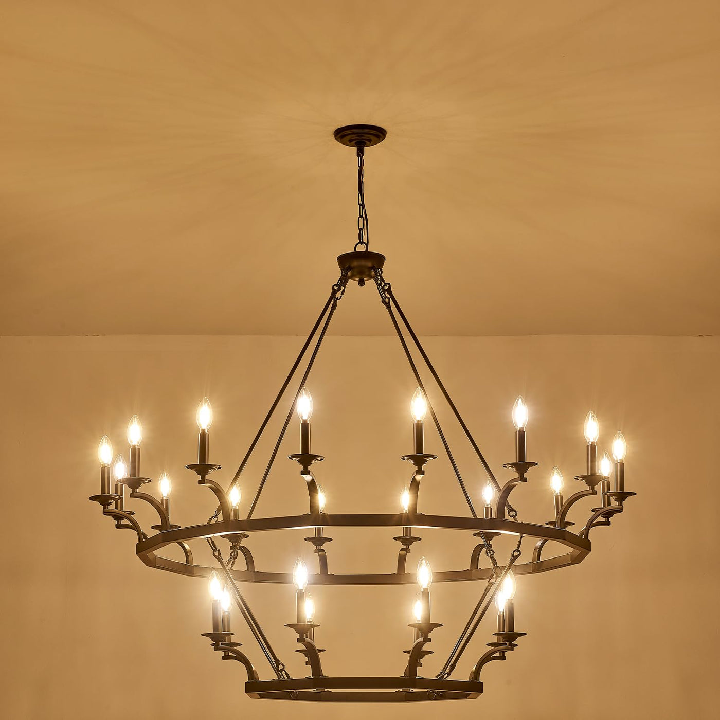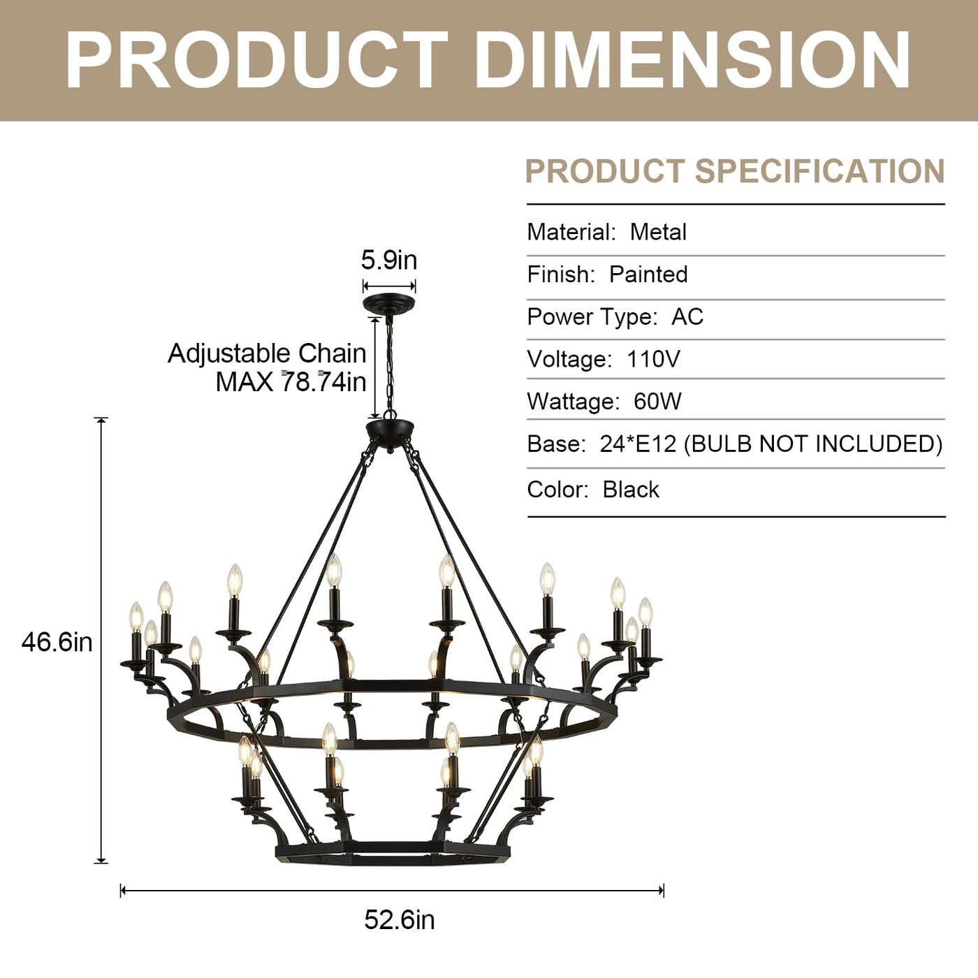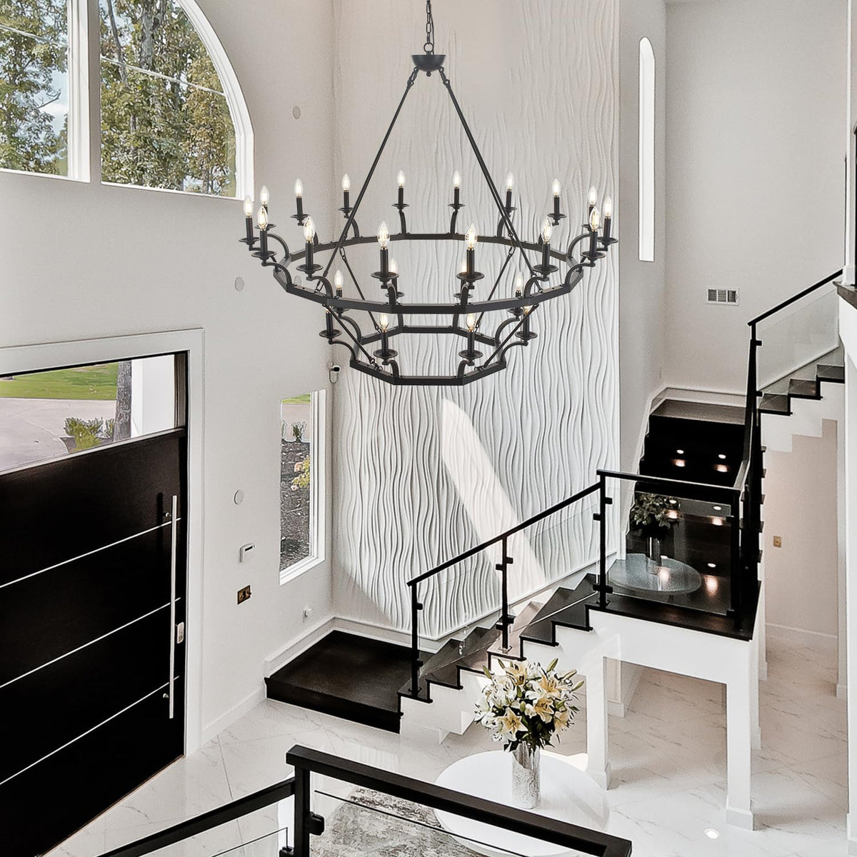 2 Tiers 52.6'' 24 Lights Large Wagon Wheel Chandelier Rustic Black Metal Ceiling Pendant Light Fixture Industrial Chandelier for Living Dining Room Entryway Foyer High Ceiling, E12 Base