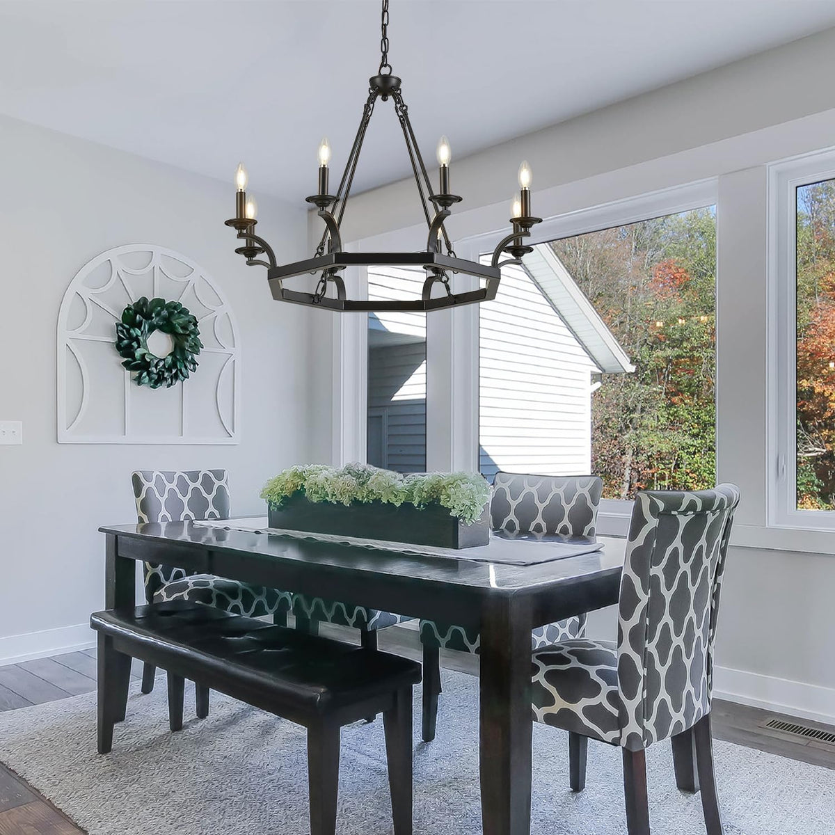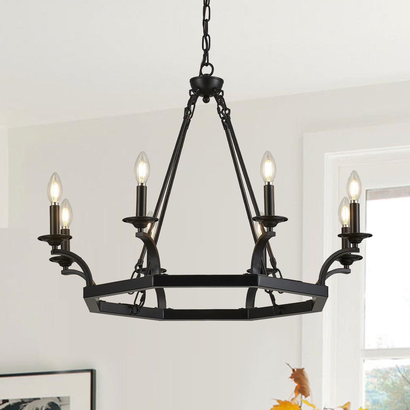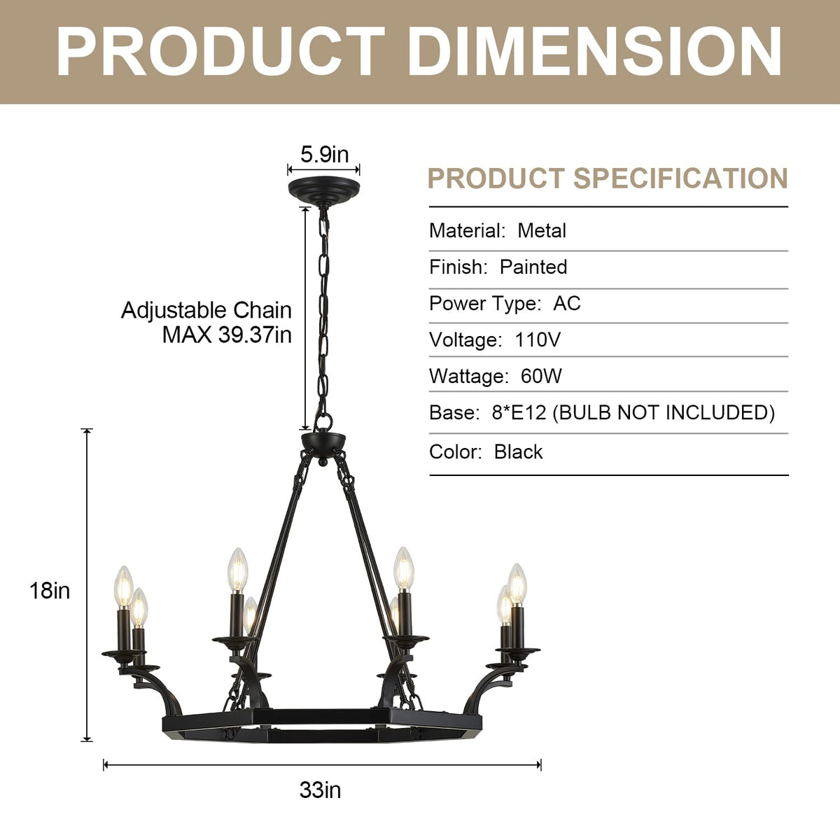 Brfaixla 8 Lights Wagon Wheel Chandelier 33'' Rustic Black Metal Ceiling Pendant Chandelier Hanging Lights Industrial For Kitchen Island, Living Room, Dining Room, Entryway, E12 Base