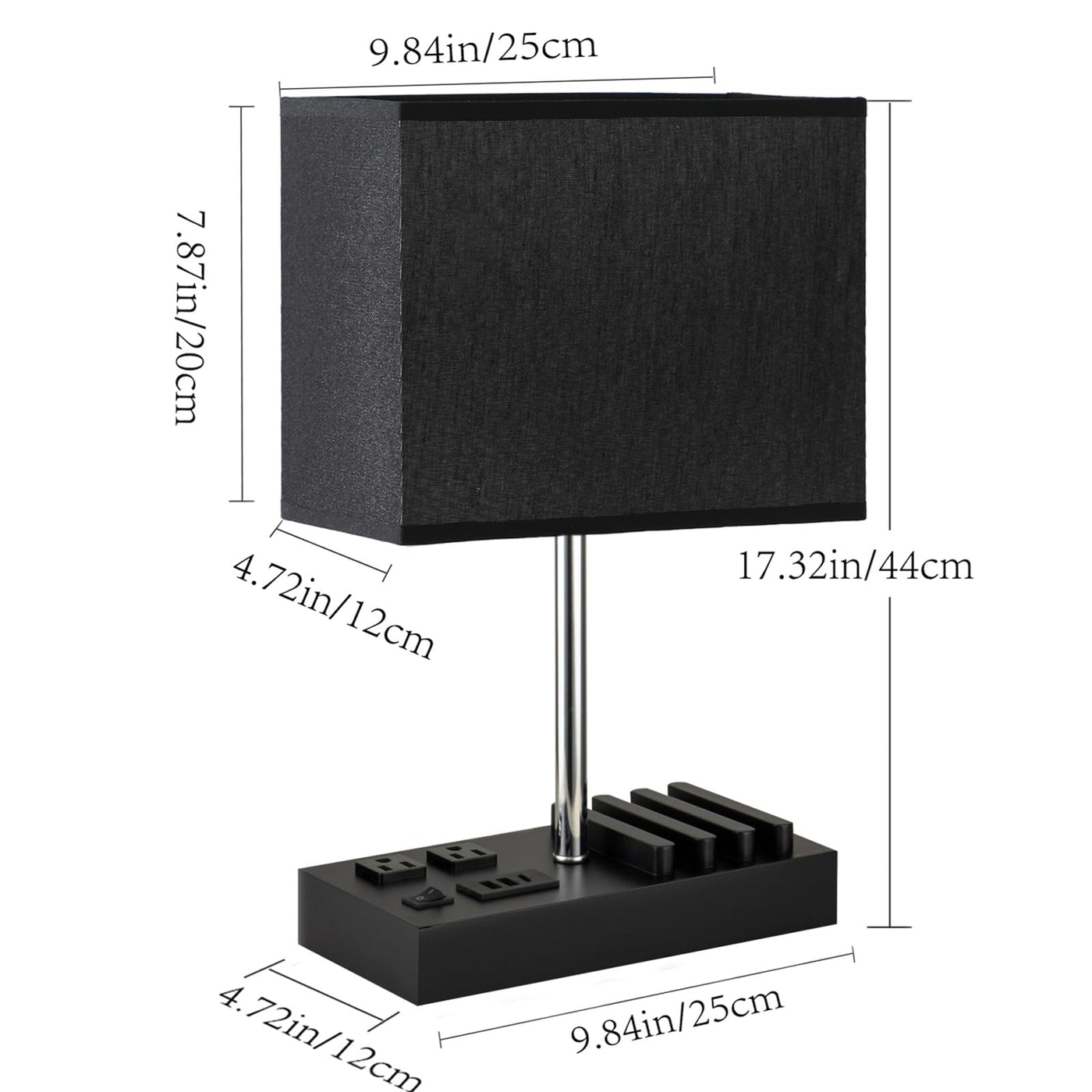 Each Family Needs This Beautiful And Multi-Functional Table Lamp: Black Wooden Base With Cream Fabric Shade Makes The Warming Light. This Table Lamp With Usb Charging Ports, Ac Outlet, And Station, Brings Convenience To Your Life And Keeps Your Space Neat. It'S Perfect For Office Desk, Night Stand, Bedside Table, Console Table, Dresser, Bookshelf. Time Saving And Fast Charging With Five Devices Simultaneously: 3 Usb Charging Ports With 3A Output And 2 Three Prongs Us Standard Ac Outlets, This Desk Lamp Enables To Charge 5 Electronic Devices Simultaneously Including Your Smart Phones, Tablets, Watches And Other Devices. It Can Work Whether The Lamp Is On Or Off. Best And Nice Gift To Your Friend Or Your Family: When You Send This Unique And Functional Table Lamp To Your Friend, Your Family As Birthday, Or Festival Gift, They Must Be Very Happy With It. It'S So Valued And Convenient To Them. Basic Information: - Ac Rated Input: 110V-130V - 3 Usb Ports Output: Dc 5V 3A (Max) - Ac Outlet Rating: Total Max 937W 7.5A 125V - Light Power: Max 60W - Light Source: E26 Base ( Bulb Is Not Included) - Ac Power Cord: 59In - Plugtype: Ul Plug - Switch Type: Rocker Switch -Base : Wood In Black -Shade : Cream Fabric Product Dimension: Charging Station Base Size: 9.8''X4.7''X1.6'' Shade: 9.8''X4.7''X7.9'' Overall: 9.8''X4.7''X17.3'' Package Included: 1X Desk Lamp With Cream Lampshade 1 Manual