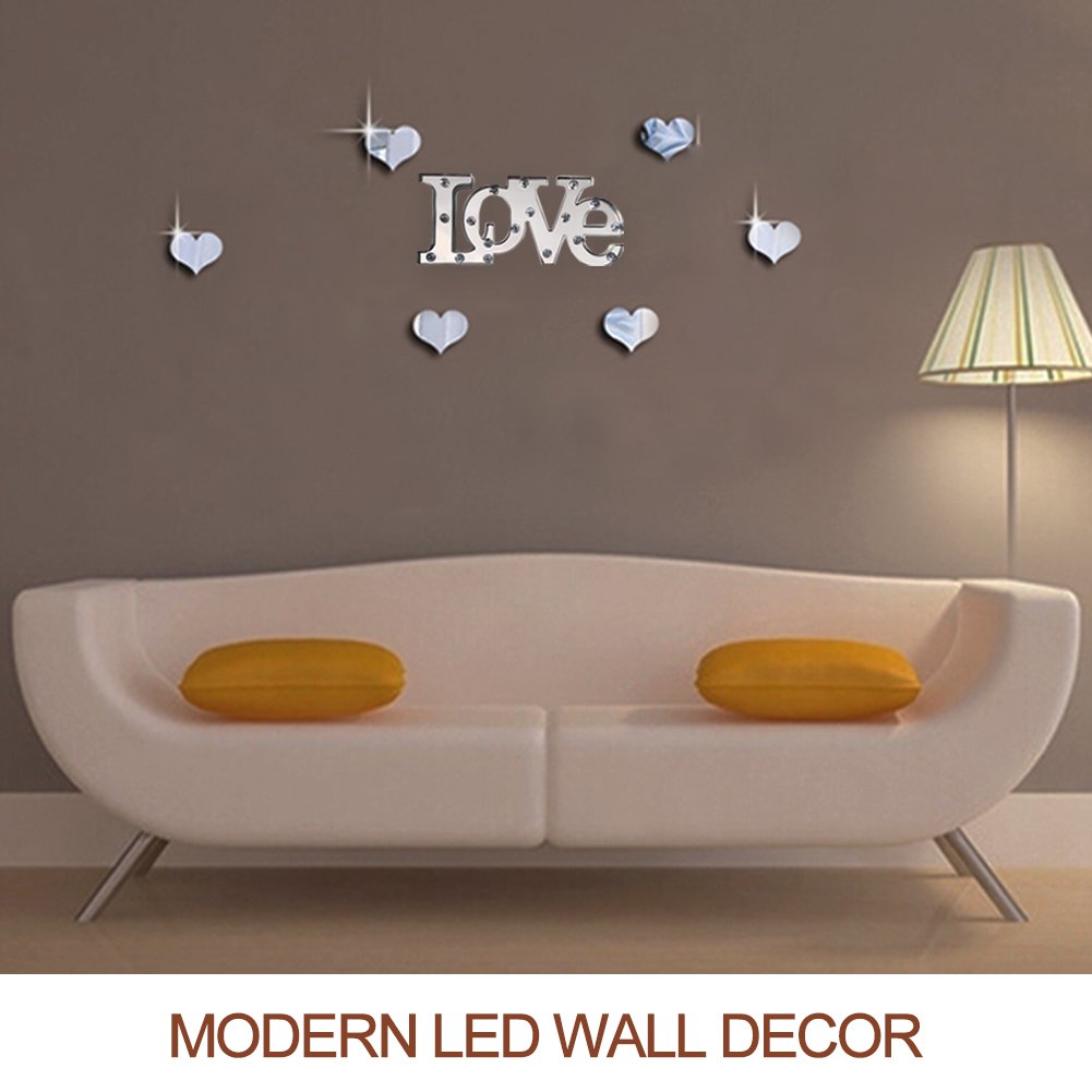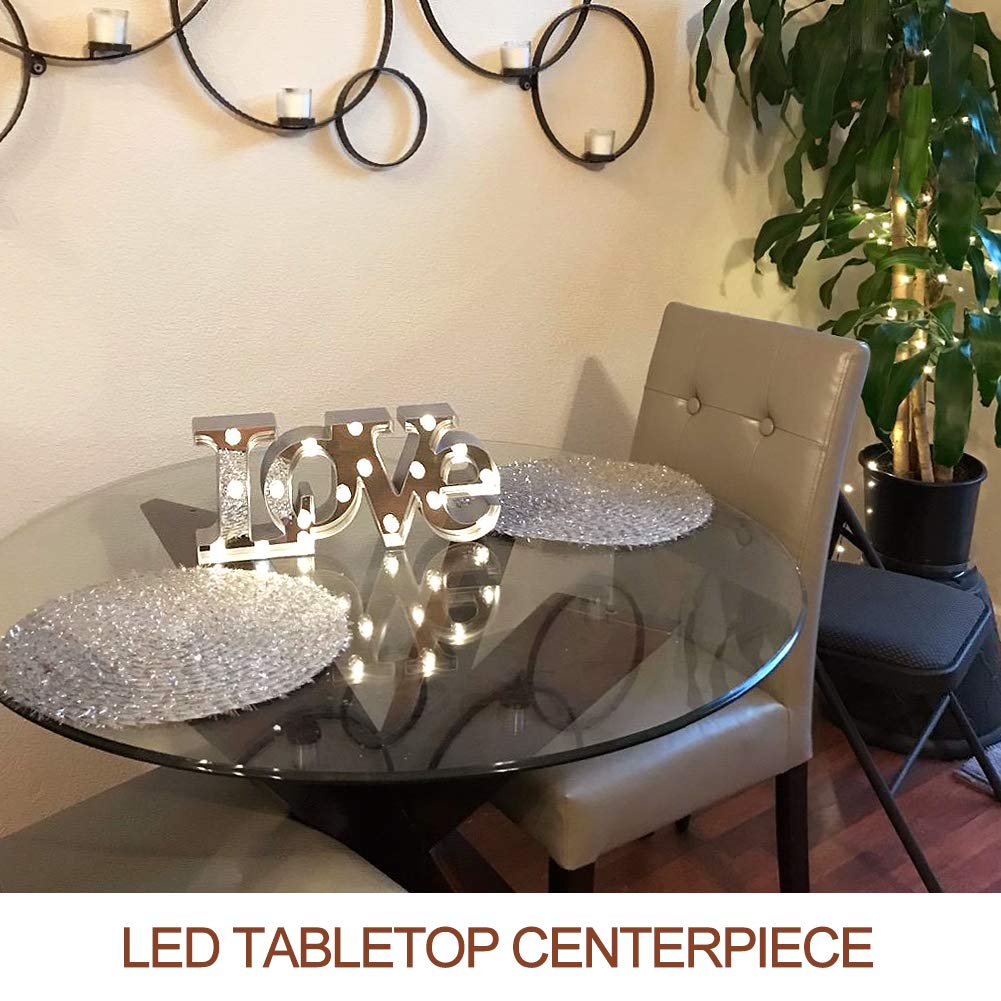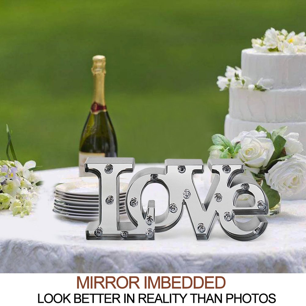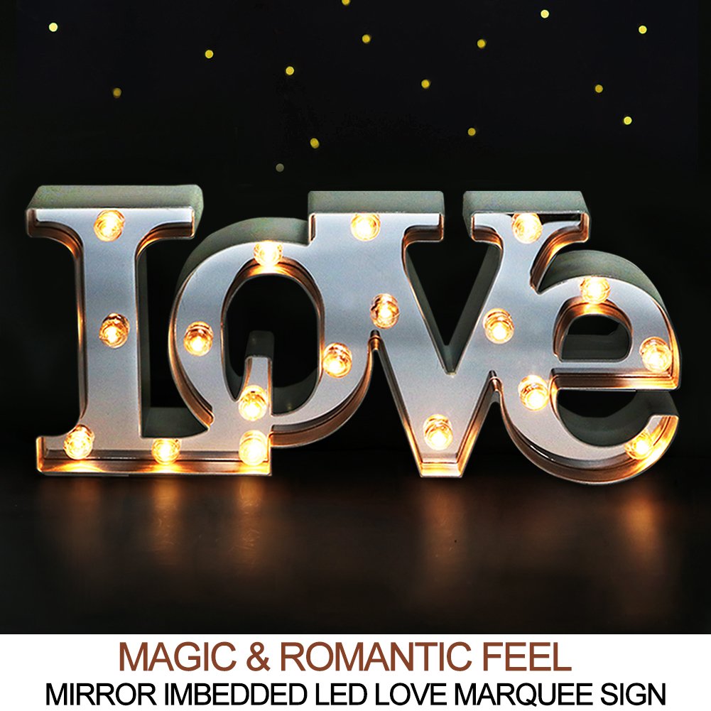 LOVE & BE LOVED WITH ''LOVE'', DAY AND NIGHT1. The7'' TALL 16'' WIDE textured LED marquee letters spell out a captivating ''LOVE'', so elegant both by day and at night, making a bold statement for your coming big day, holidays, and everyday.2. At night, 18 LED bulbs inside the marquee light up ''LOVE'' in romantic warm white glow, emitting adoration & affection.3. An inspirational way to separate your bedroom, anniversaries, holidays, special events from the others.LIGHTED ''LOVE'' MARQUEE SIGN DECOR1.The marquee LOVE displays in warm white glow as if seen from the fireplace, creating a cozy ambiance; bringing romance and warmth to any place, especially valentine's day decorations, wedding reception tables, etc.2. Used it as a signal or combined with other pieces to create a gorgeous display.3. Place it on your table as a fantastic tabletop centerpiece4. One keyhole slot at back for an easy wall decorLET TIME BE YOUR CONVENIENCE1. 6hr Timer: Once the light is switched on, the timer is triggered. The light will stay on for 6 hours and remain off for 18 hours, only to light up again for another 6 hours automatically.2. Suitable for both daily home decorations & festival decorations to increase festive ambience.ENERGY-SAVING & DURABLE1. No power outlet needed & requires 2 AA batteries (included).2. 18 long lasting LED bulbs provide low energy consumption while enhancing your festival cheer & produce no heat after long-time use.FAQs1. It will always be in the OFF position when you receive your order, you will need to switch it to the ON position (at back) during installation.2. An ON/OFF switch is at back.ATTENTION1. Store the light in a cool & dry place and remove batteries if product is not to be used for a long time.2. Please handle this product with care to avoid damage to the bulbs.