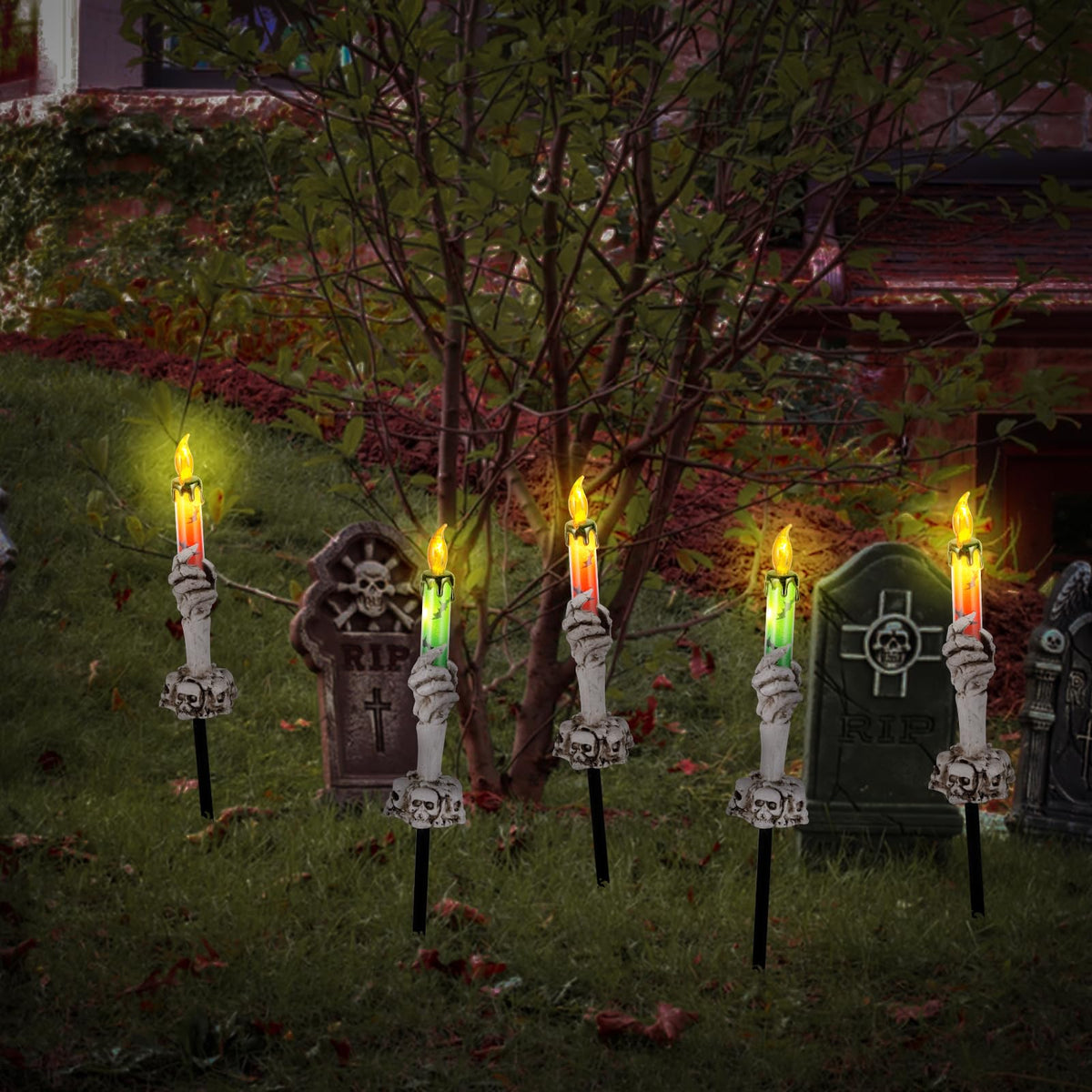 Q: Where can I place these Halloween decorations for the best effect?A: These Skeleton Hands Candle Lamps are perfect for enhancing your Halloween atmosphere. They can be used as pathway lights or in-ground lights, making them ideal for gardens, flowerbeds, along fences, and walkways.