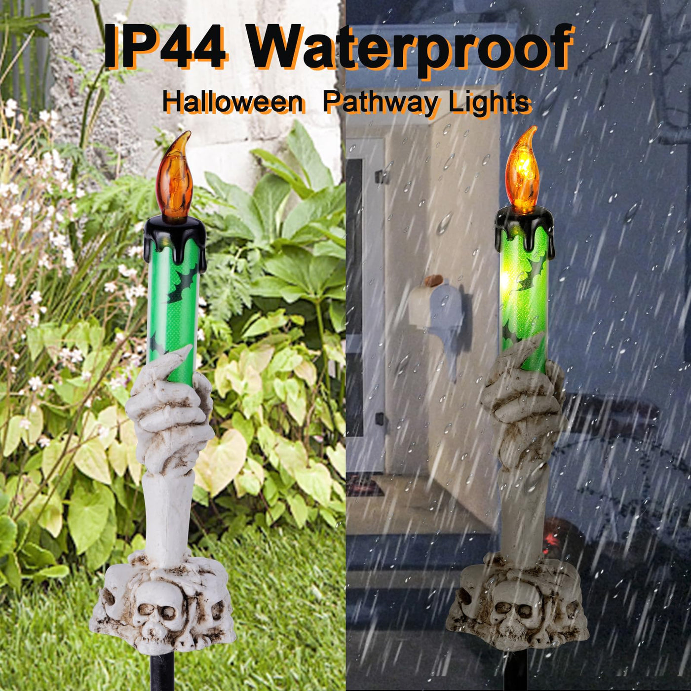 Q: Are these Halloween pathway lights waterproof?A: Yes, these pathway lights are made of high-quality plastic with an IP44 waterproof rating, making them durable and suitable for outdoor use in various weather conditions, including rain, sleet, and snow.