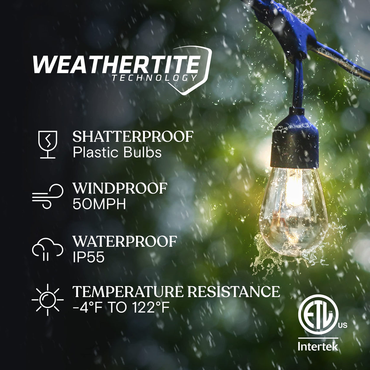 - Commercial Grade Weatherproof Design: Equipped with WeatherTite technology, these patio lights withstand winds up to 50MPH, rain, and snow. Shatterproof plastic bulbs and a flexible heavy-duty cord ensure durability for both indoor and outdoor use.