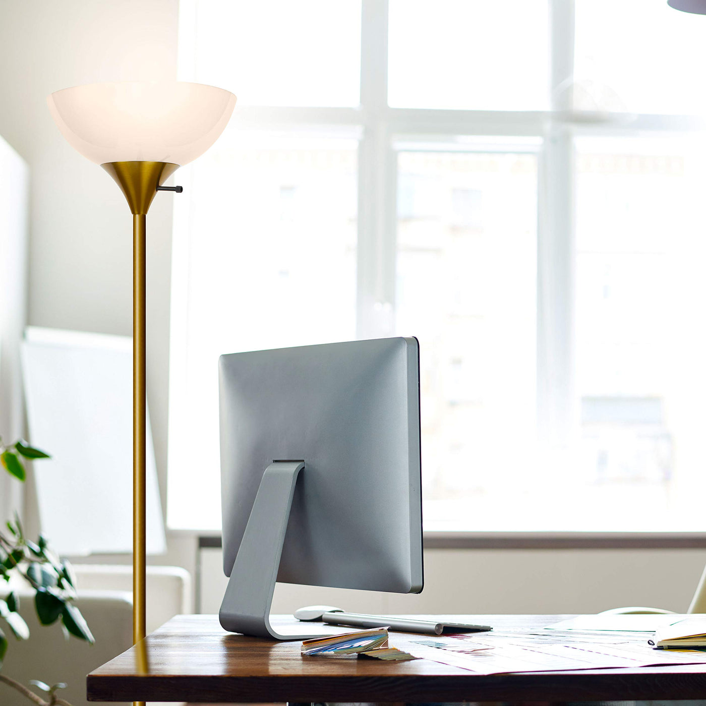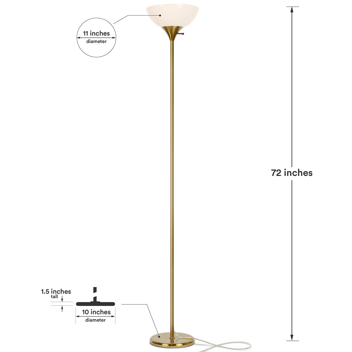 Capable of both mood and task lighting, Brightech's Sky Dome LED Torchiere Floor Lamp solves your home or office needs brightly and efficiently without breaking a sweat or your budget. Our modern Torchiere casts an impressive warm white glow like sunlight in any direction, providing more than enough light to light a large bedroom. The Brightech Sky tall lamp burns cool with long-lasting LED lights that don't produce heat like the halogen or incandescent lighting of traditional Torchiere floor lamps. Our power-saving 3 way LED bulb (6, 8, and 16-watt settings) stays cool, even as your living space bathes in its warm white light for hours. Adjust brightness level with a simple twist of the rotary control 3-way switch at the top of the pole. Effortlessly create the right amount of light at any given hour of the day - the dimmest setting can even be used as a night light. Or, use a smart bulb to create the modern, high-tech style that suits you best!Easy Assembly, Easier To LoveThe simplicity of the standing lamp's design allows you to have it upright and glowing within minutes. Your energy-saving floor lamp for living rooms will arrive packaged with the light fixture, pole sections, floor lamp base, and plug-in adapter wrapped separately. Jet black, antique brass, and platinum silver finishes are available to accommodate your interior design or color scheme. The slenderness of the lamp allows you to position it in the tightest corners or spaces. The lamp cord extends just over 7 feet. In addition, the LED light has an expected lifespan of over 20 years, so you won't have to replace it any time soon!No Wobbles, No Worries!The SKY Dome's durable sturdiness makes it ideal for playrooms too, the weighted base means children or pets can't tip it over.Never Buy Torchiere Bulbs Again Thanks To Brightech LED!Height- 72 inchesBase Dimensions- 10 inches wide, about 1.5 inches tallShade (plastic) Dimensions- 11 inches