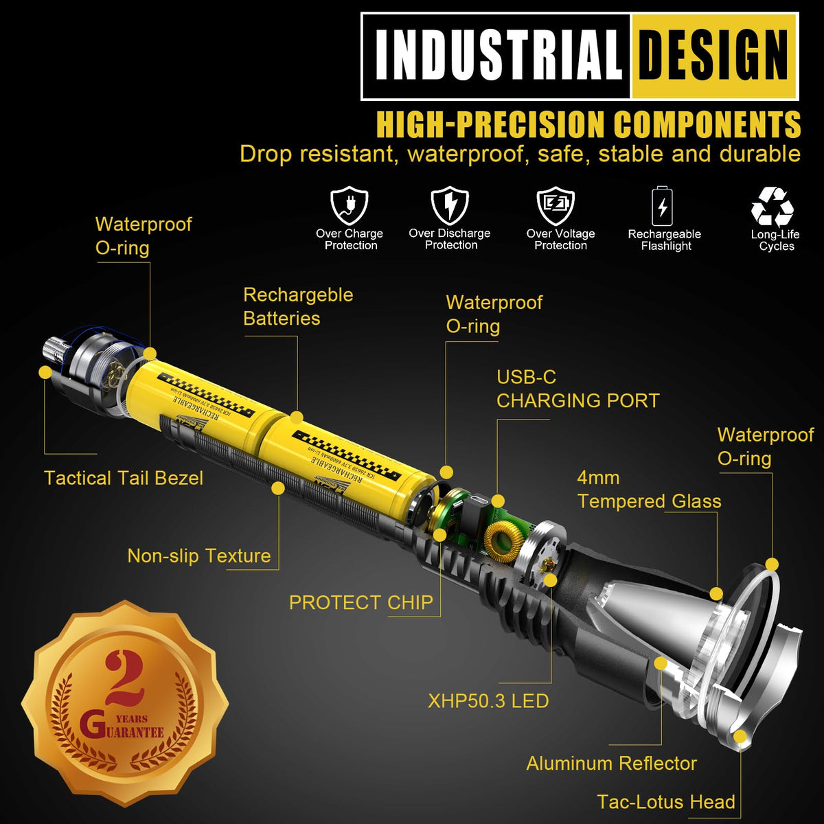 What You Get: Each package includes 1x TCP50PRO Rechargeable Flashlight, 2x high-capacity rechargeable batteries, 1x USB cable, and 1x user manual.
