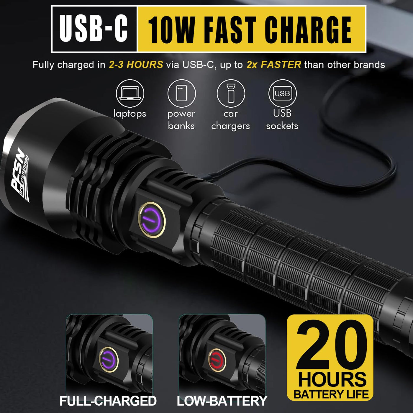 Q: What charging options does this flashlight offer?A: The PFSN tactical flashlight features a USB C fast charging system, which is 2 times faster than similar products, allowing for quick and convenient recharging.